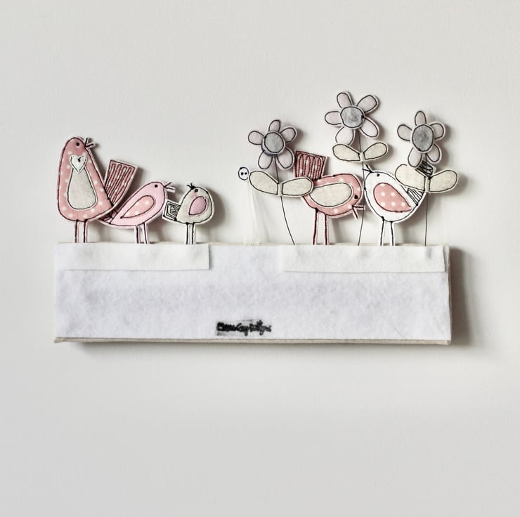 The letters, birds and flowers are sewn using multiple layers of cloth, free hand machine embroidery and cut out by hand using very sharp scissors.