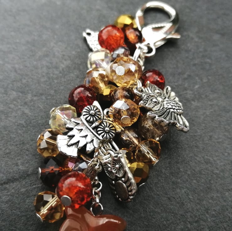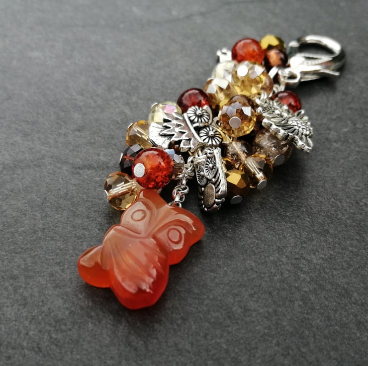 This beautiful bag charm has been made using all glass beads, silver plated chain and charms. The main stone at the based is carnelian.