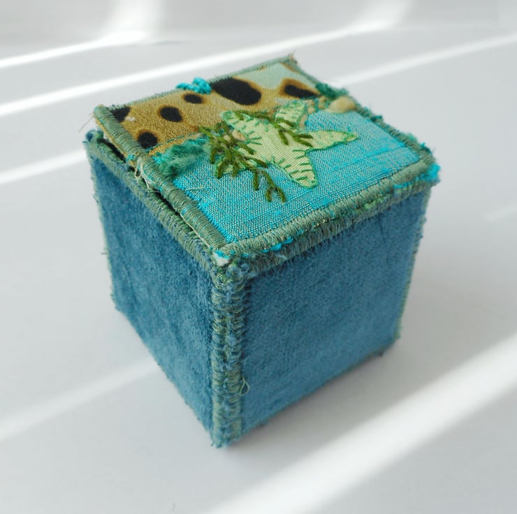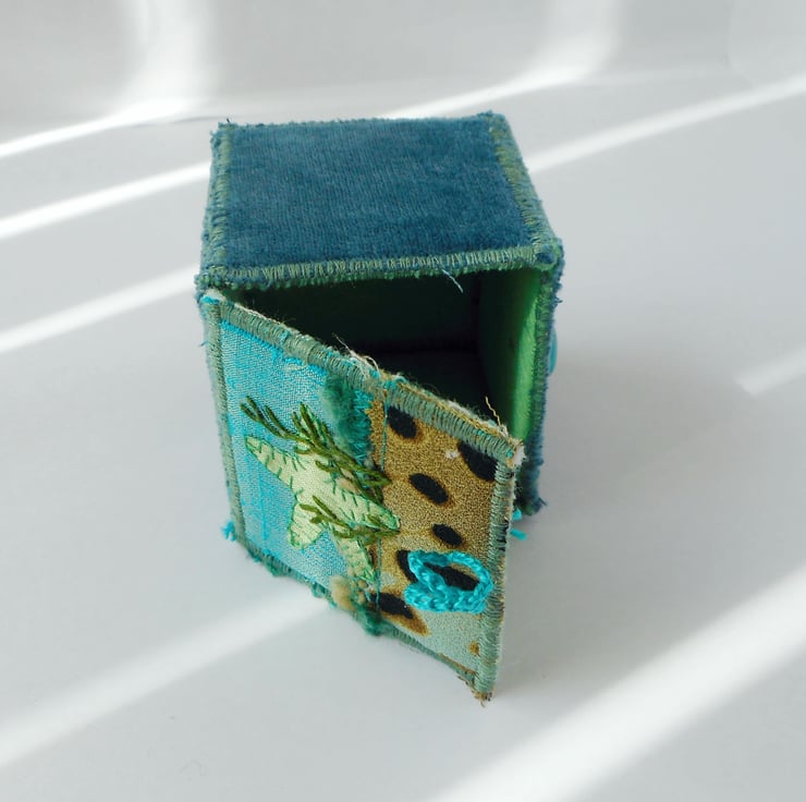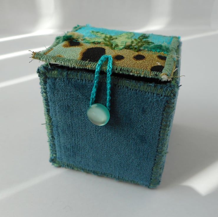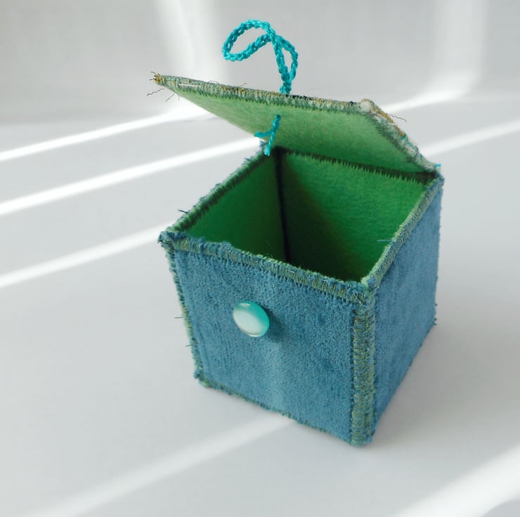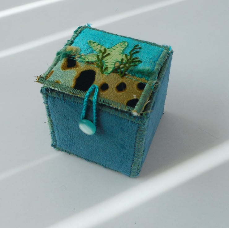 The lid is an underwater seascape inspired by the rockpools I explored as a child in my estuary village, and is made from fabric I’ve handmade from scraps and offcuts, layering and cutting them, before using needle felting and embroidery to add texture. The box is fully lined in wool felt in a co-ordinating mint green. A recycled blue button has been securely stitched to the front and is used with a loop of co-ordinating thread to close the treasure box.