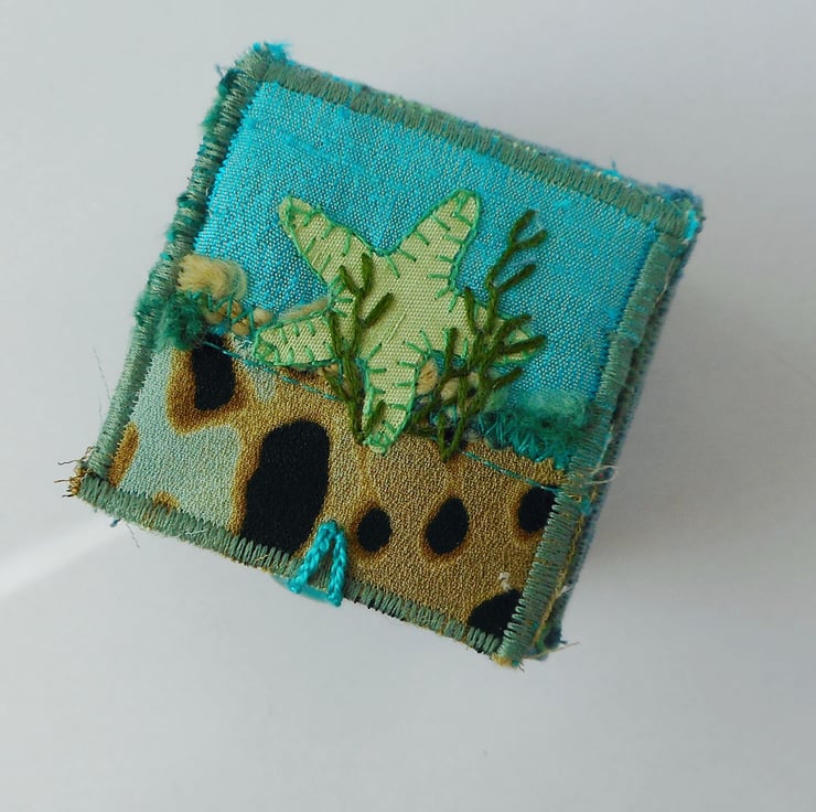 Rockpool is a small textile box in aquamarine velvet with a textile-art lid. Colours have been kept subtle, with a delicate green starfish appliqued onto the background. Seaweed has been hand embroidered, and further texture added with needle felting and wool.