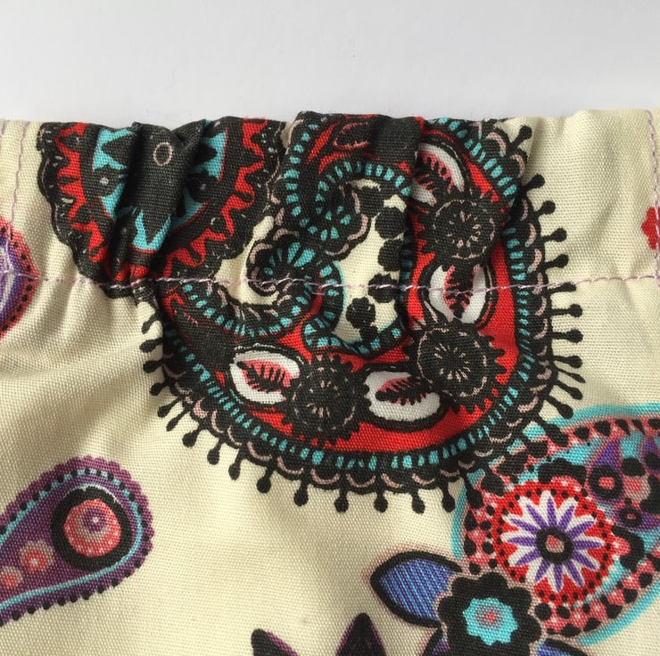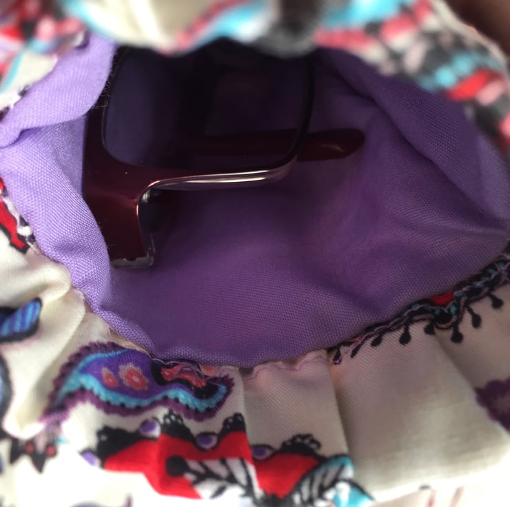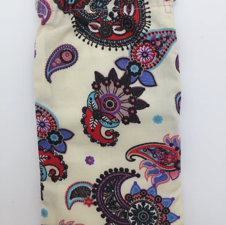 Fabric glasses case in a fresh paisley design. The case is fully lined in a purple cotton and internal padding gives protection to spectacles or sunglasses. A flex frame has been used so you just need to pinch the sides to open the case and release to close.