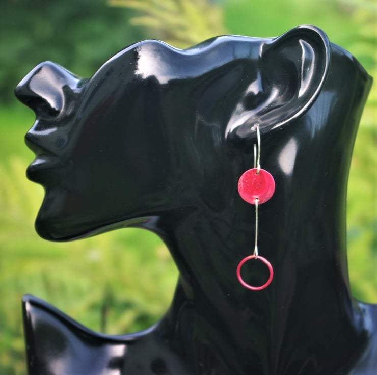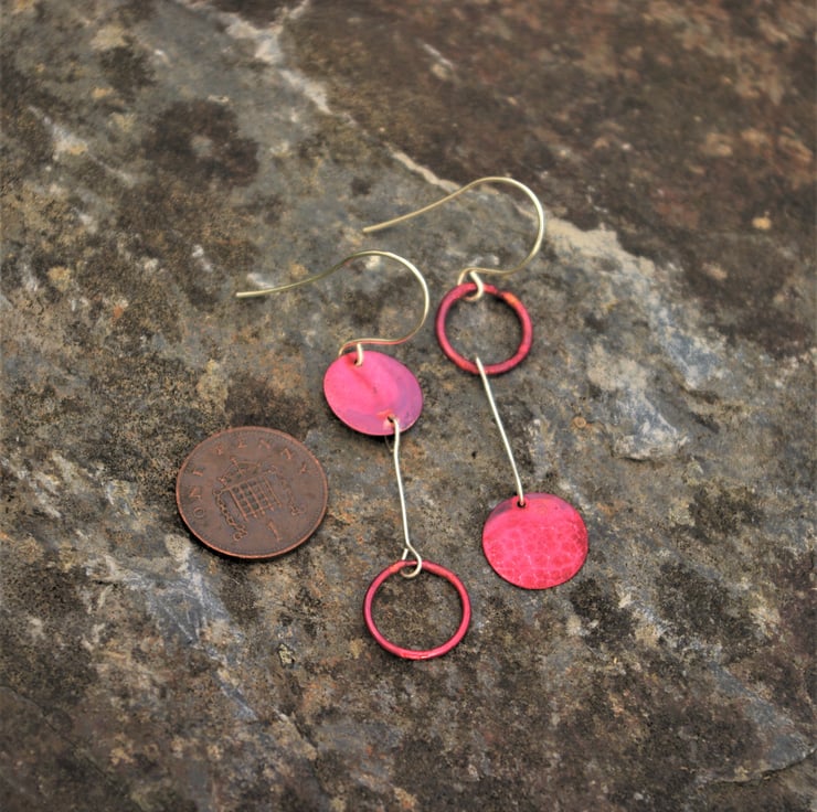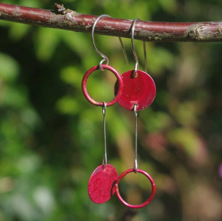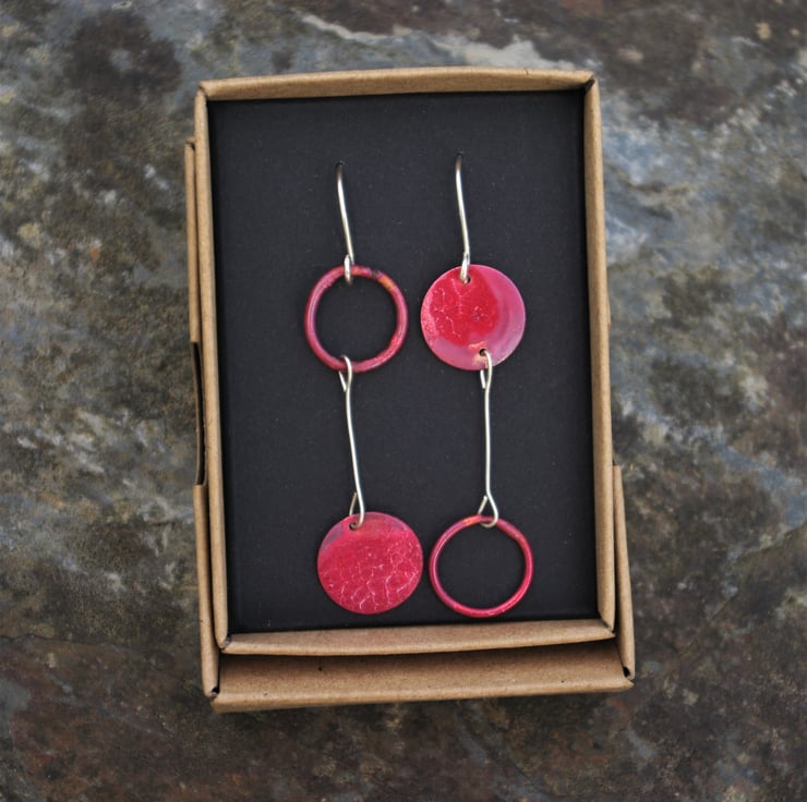 Mismatched copper discs and copper hoops earrings. I have treated the copper with heat to produce lush red , orange and purple tones with added interest of some surface texture.They are all 15mm just over half an inch in diameter and joined together with sterling silver wire with handmade sterling silver earhooks.