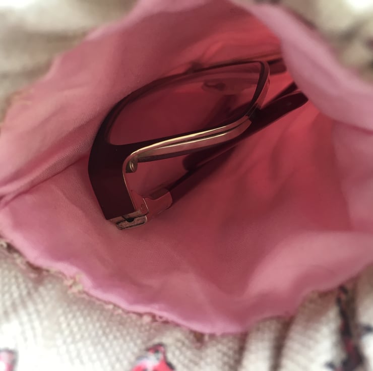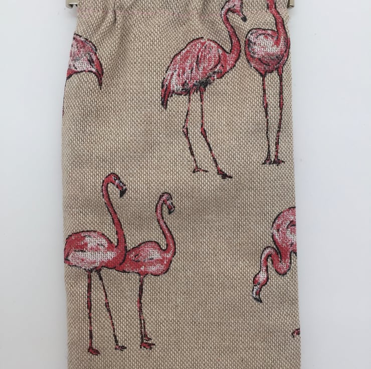 Fabric glasses case featuring flamingoes. The case is fully lined in a pink cotton and internal padding gives protection to the glasses or sunglasses. A flex frame has been used so you just need to pinch the sides to open and release to close.