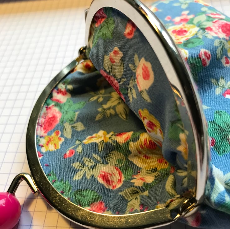 A lovely Sky Blue printed vintage look fabric made into a clasp coin purse. The clasp is sewn into this coin purse and is a bright pink ball , silver metal type. The background of this printed cotton fabric is a lovely Sky Blue shade and it has vintage looking floral flowers and leaves. The lining is the same fabric. The size is approx 14cm x 13cm so is perfect for a little coin purse gift .