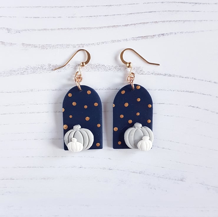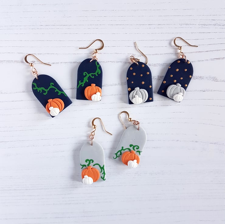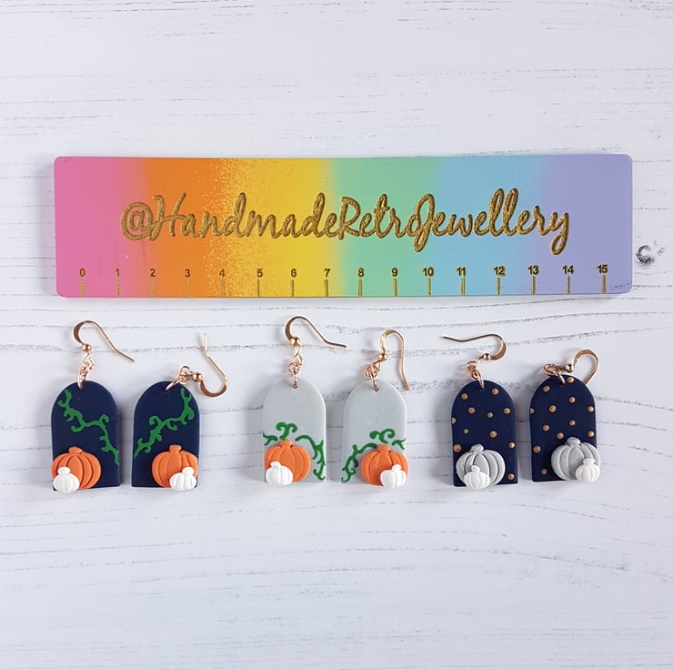 These beautiful earrings have been carefully hand crafted using polymer clay featuring two coloured pumpkins placed onto a backing piece of clay in an arch shape, with detail on the arches hand painted using acrylic paint. Fixed onto hook style fixings for a drop effect. A great way to welcome Autumn and the change of seasons!