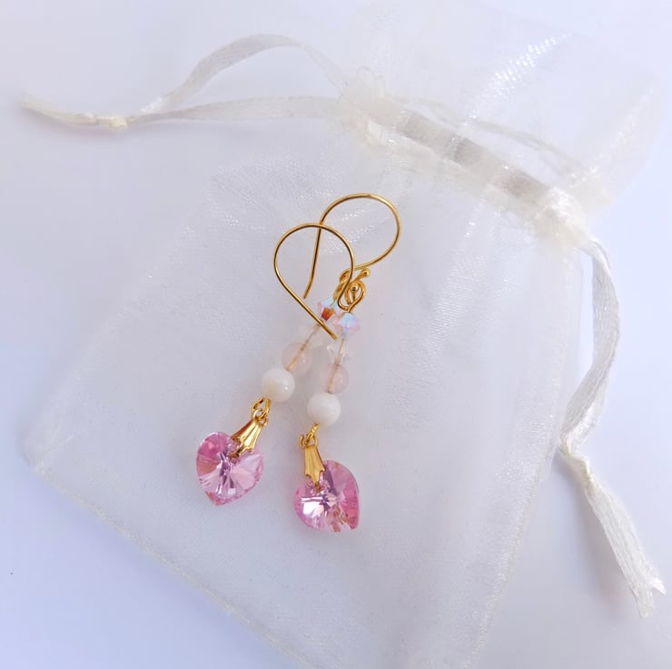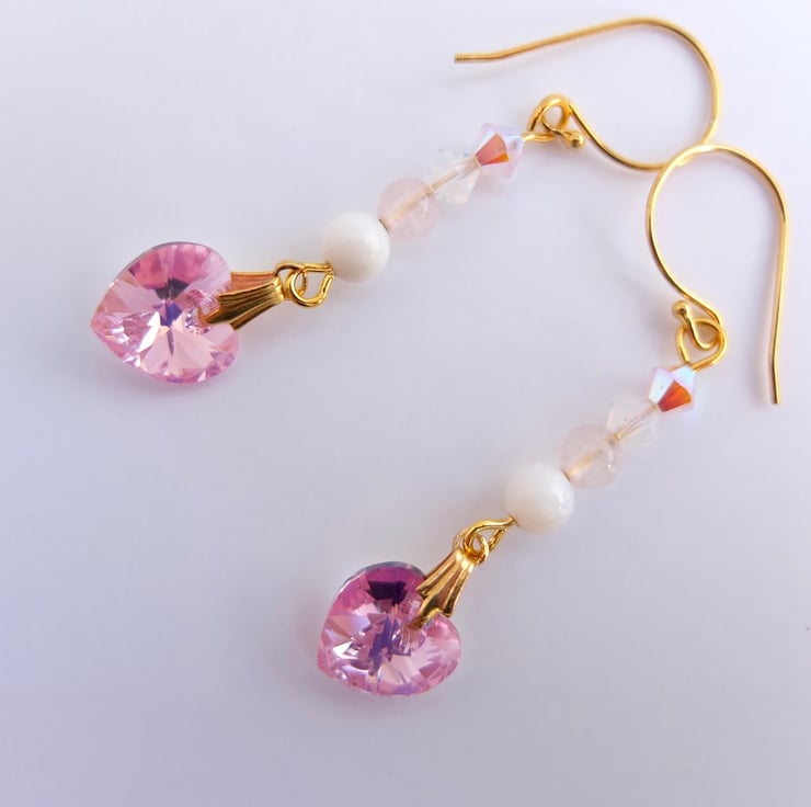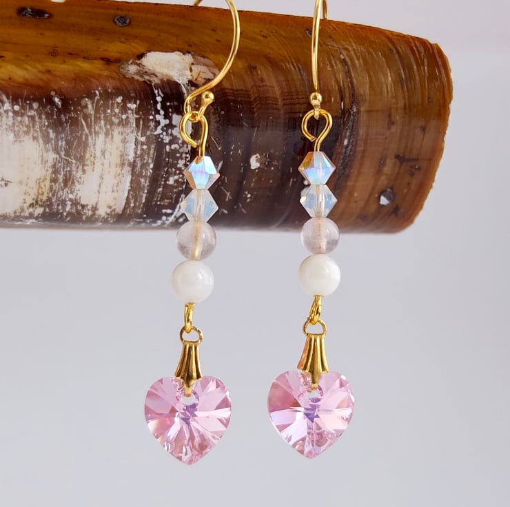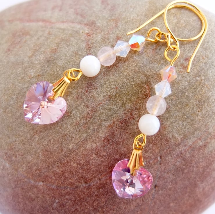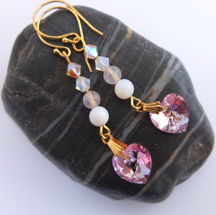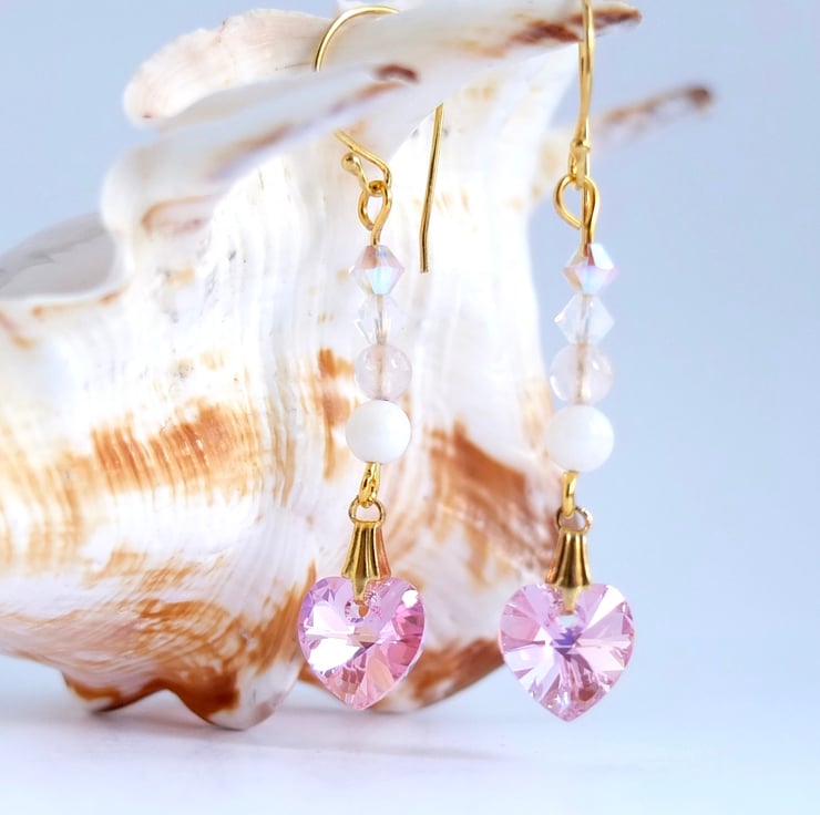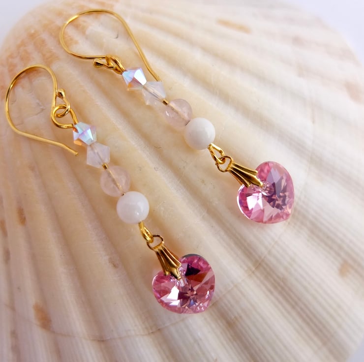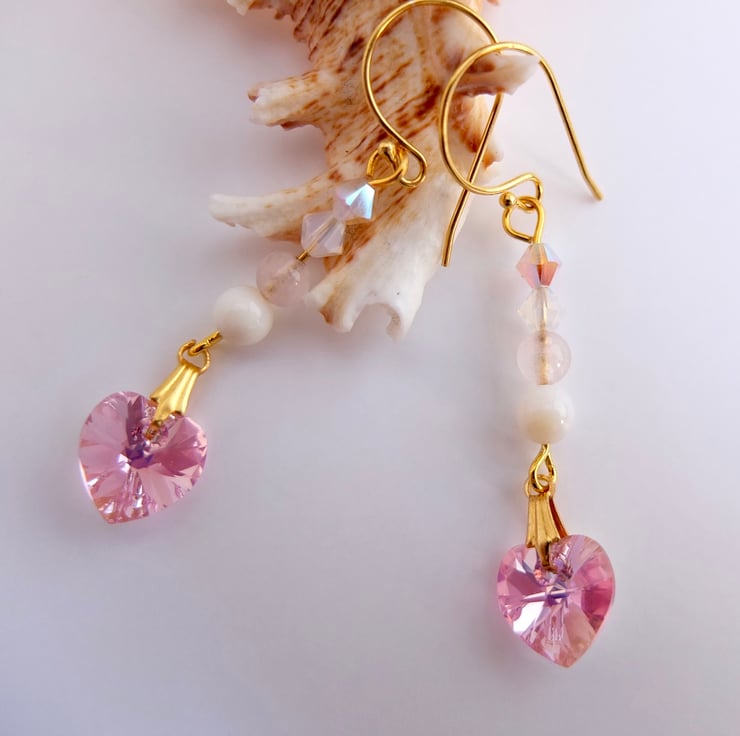 A super-sparkly Swarovski 10mm crystal heart in the colour "light rose"hangs below beads of shell and rose quartz, and Swarovski crystal bicones in the colours "white opal" and "rosewater opal"