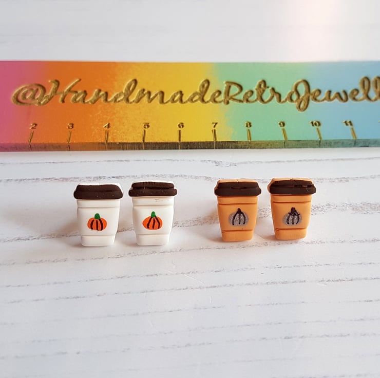 These mini coffee cup earrings have been carefully hand crafted using polymer clay, cut in the shape of teeny tiny travel cups. They have a painted lid and mini pumpkin painted in the middle - choose your colour way! Sealed with a gloss to protect.