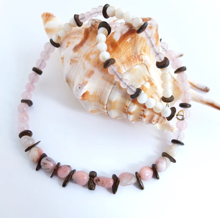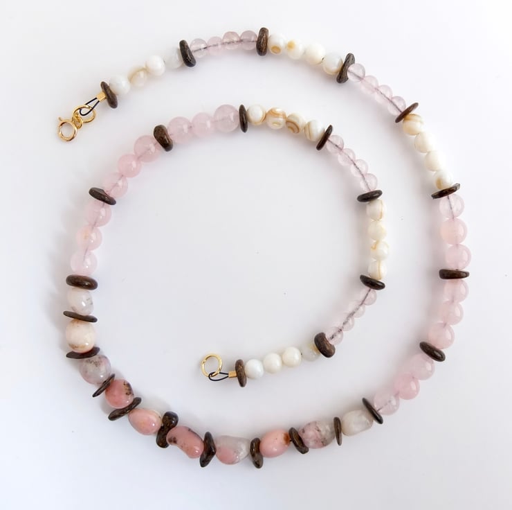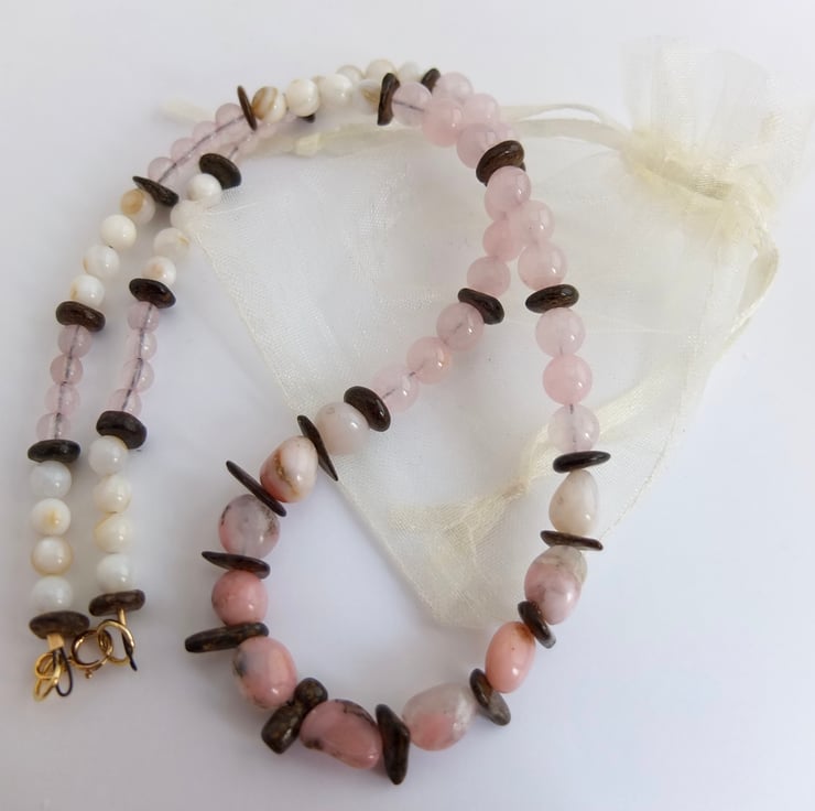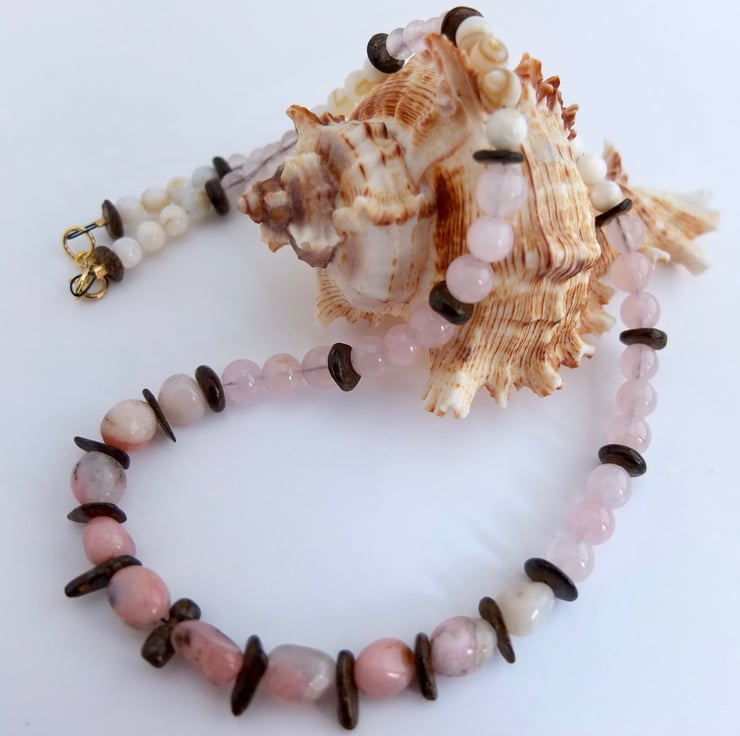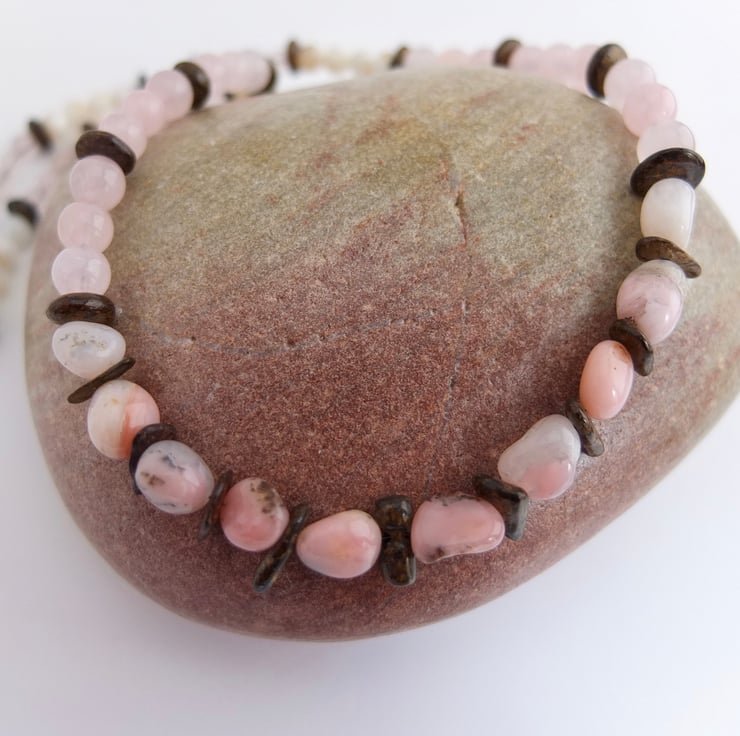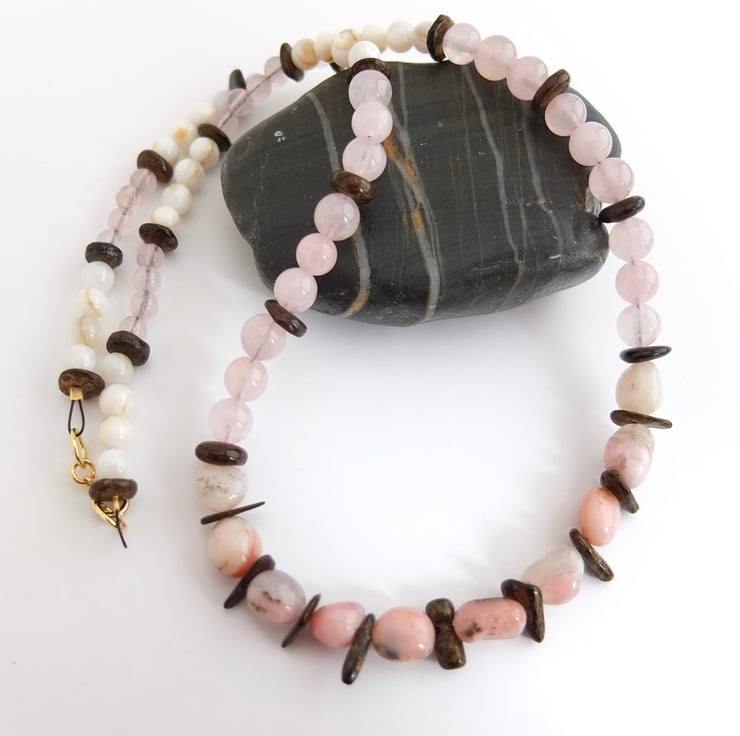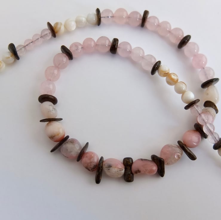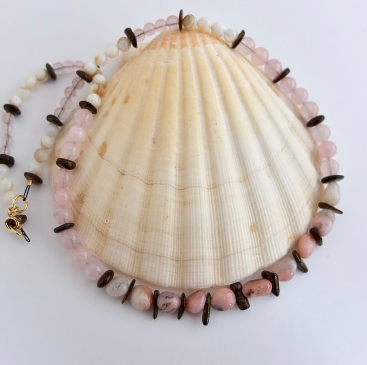 Rose quartz 6mm beads graduate to smaller shell and rose quartz rounds, separated by discs of bronzite.
