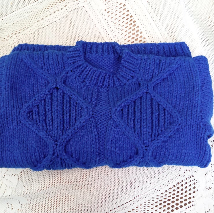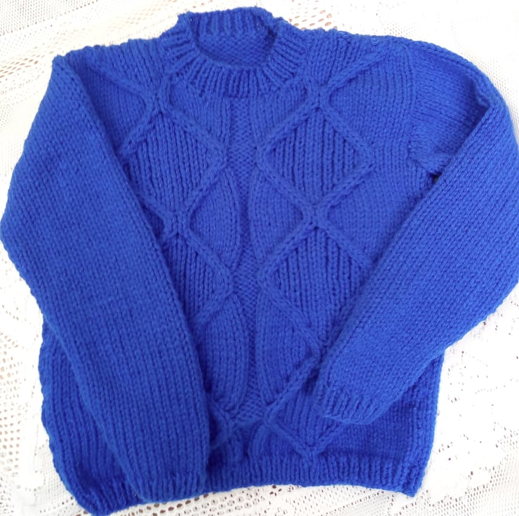 Lovely cabled double diamond patterned child's jumper hand knitted in chunky yarn for additional warmth. The jumper is not in stock but it can be made for you in a size and colour of your choice, please state colour required when you order. Available sizes are shown below. The processing time for this jumper will be 1 - 2 weeks to produce and post to you.