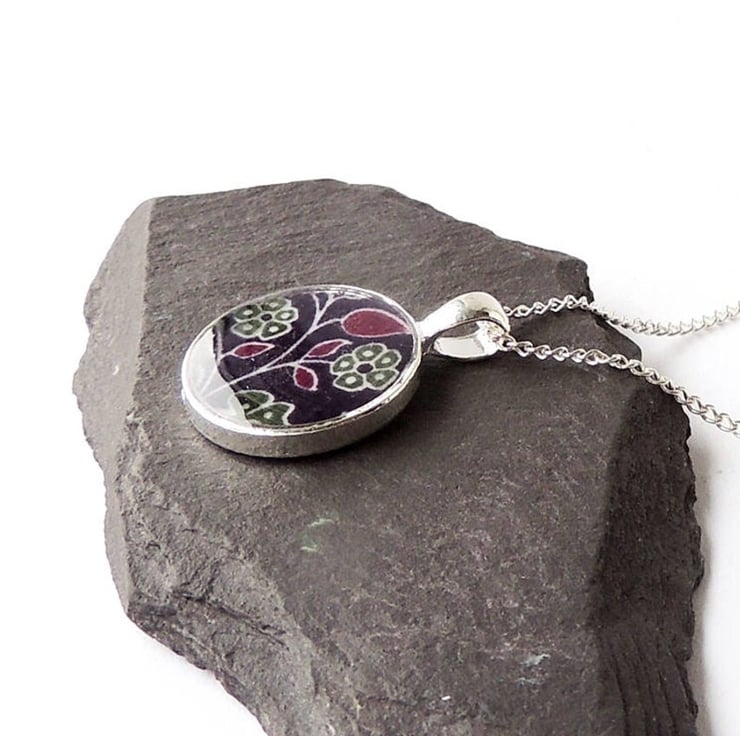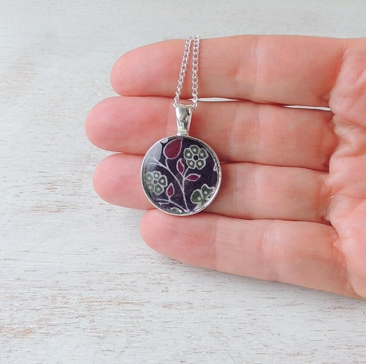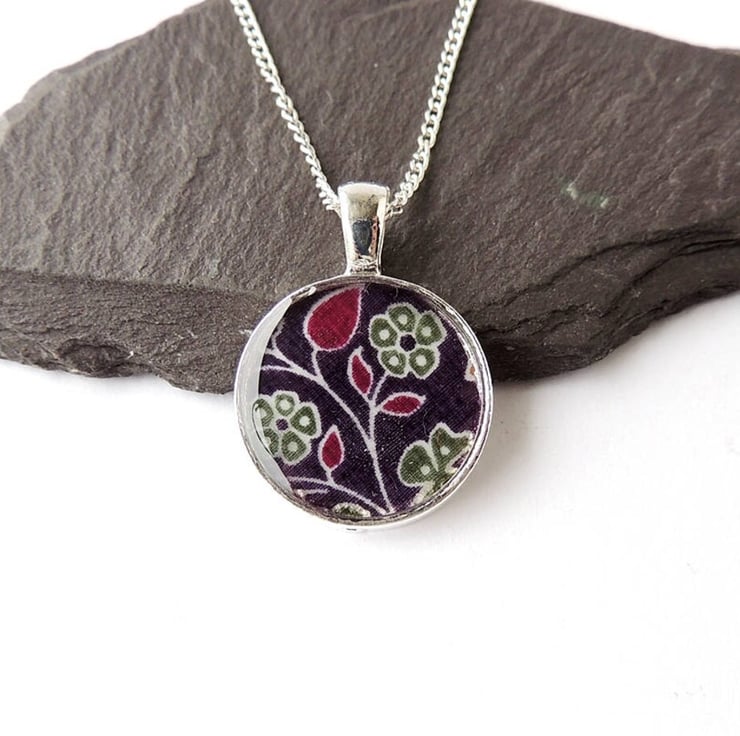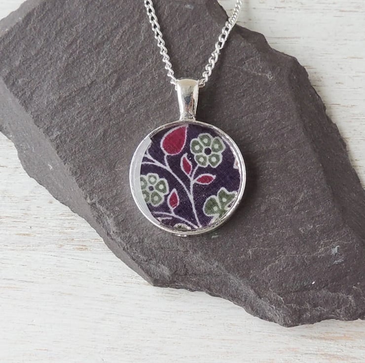 This necklace has purple fabric with a flower pattern captured under resin. It comes on a 18 inch chain.