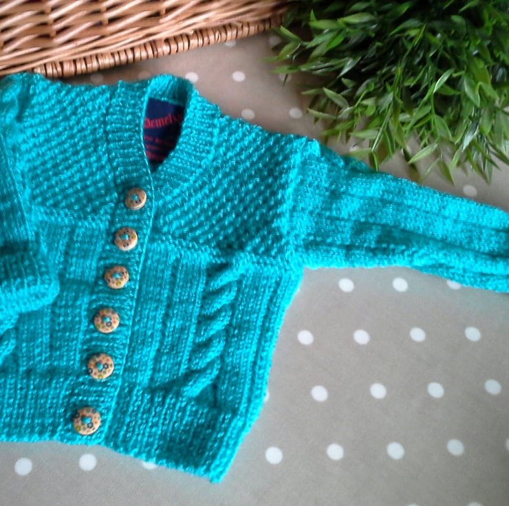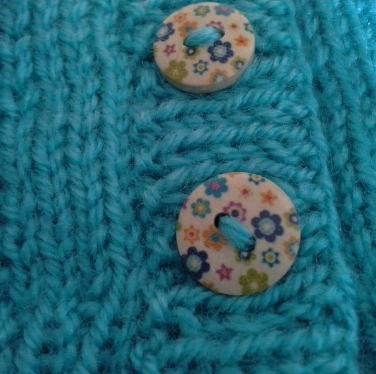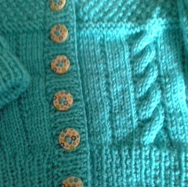 A sweet cosy warm practical baby girls cardigan designed and lovingly hand crafted using quality branded British machine washable yarn. The buttons are made from genuine wood with a delicate flower design on them. The garment has the designer branded garment label attached to the back neck edge with the care instructions woven within in it on the reverse side.