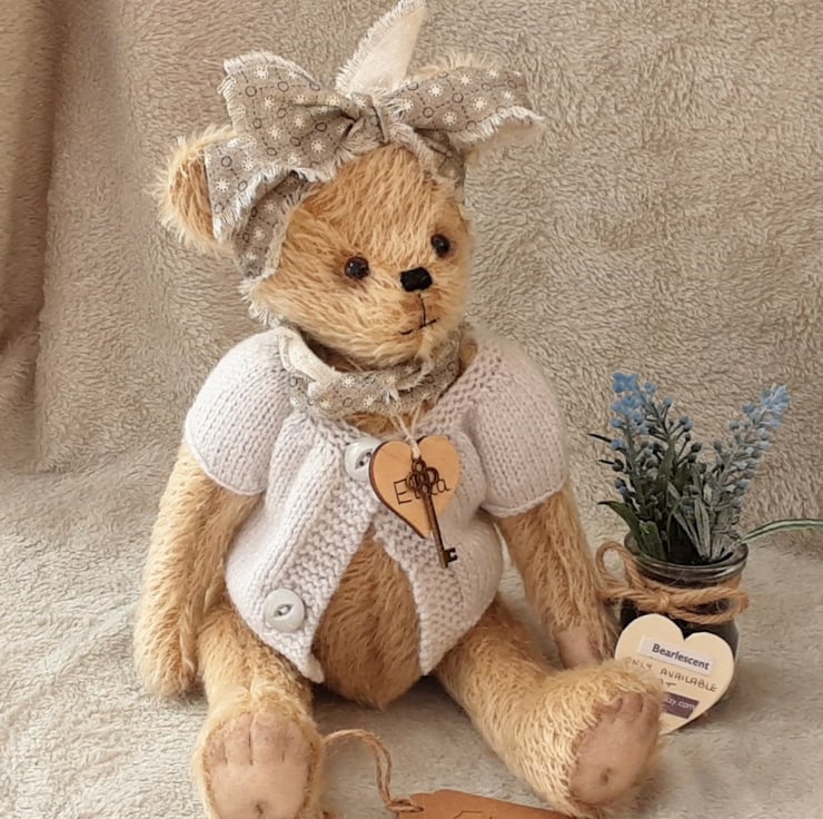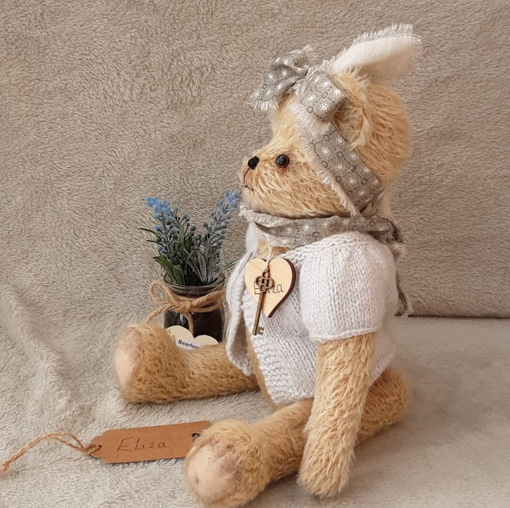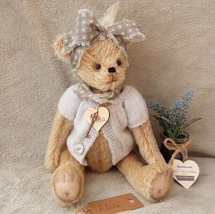 Eliza wears her name on a wooden tag and Bearlescent is to the back of one ear on a polymer clay button, she also has a little key attached to her name tag.