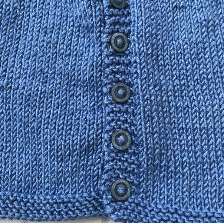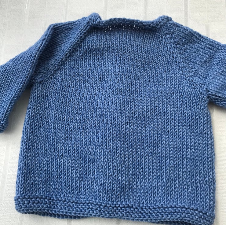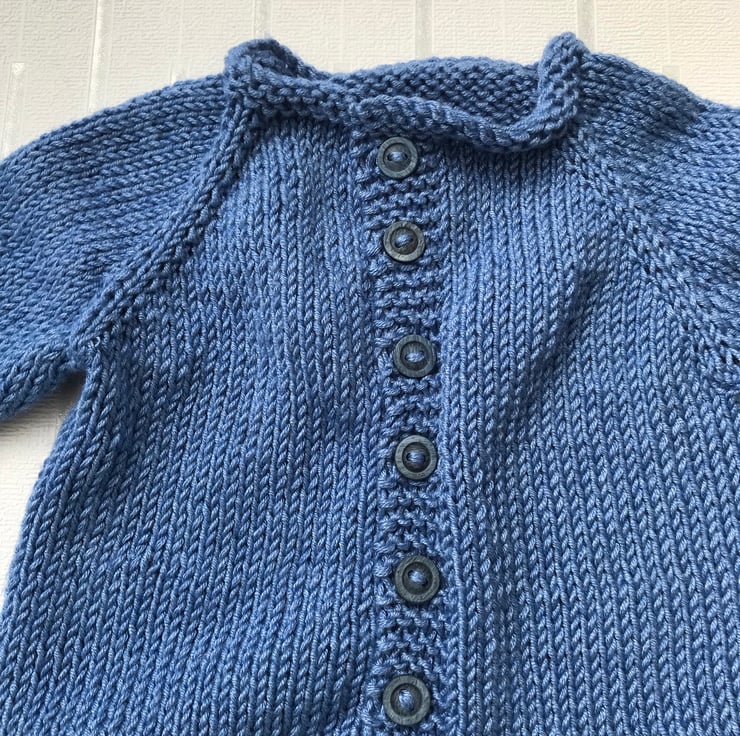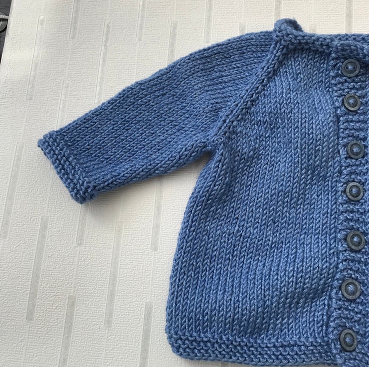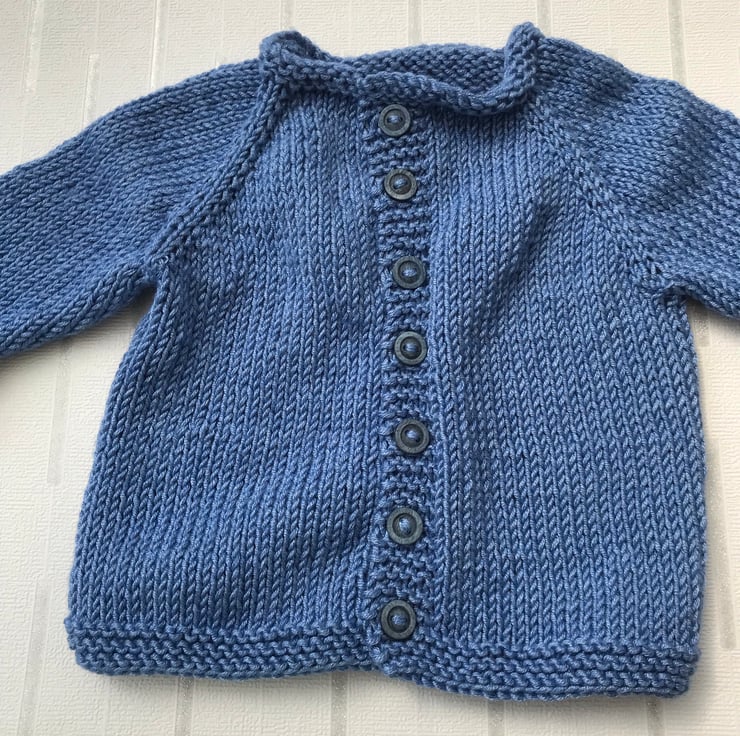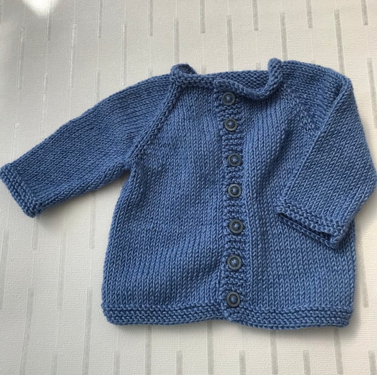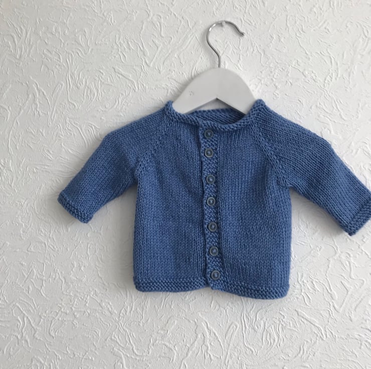 A hand knitted baby cardigan worked in a bamboo and wool yarn. The cardigan buttons up to the neck, has raglan sleeves and garter stitch borders.
