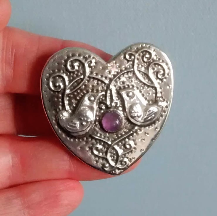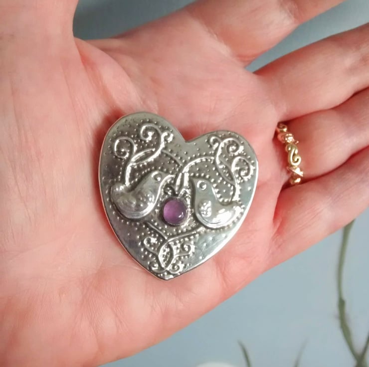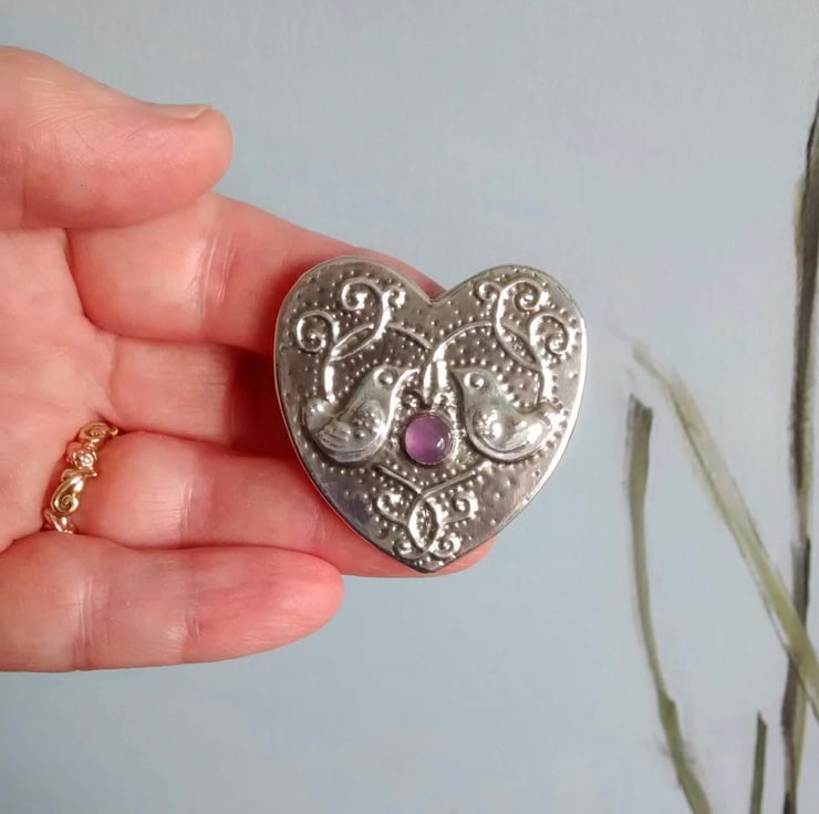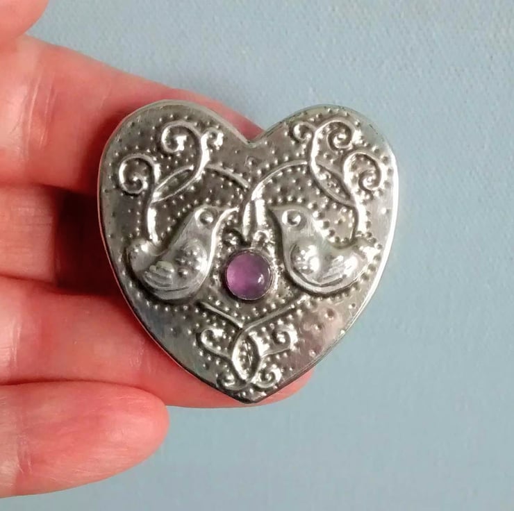Silver heart lovebirds brooch in pewter with amethyst. Inspired by The Strawberry Thief design by William Morris, I have crafted this eye-catching brooch in lead-free pewter and set it with a genuine pale purple amethyst stone. Modern pewter glitters particularly beautifully in artificial light and candlelight. This brooch is light in weight so suitable for wearing on a variety of fabrics. Measurements 39mm x 40mm. Sent wrapped in tissue in an organza bag.