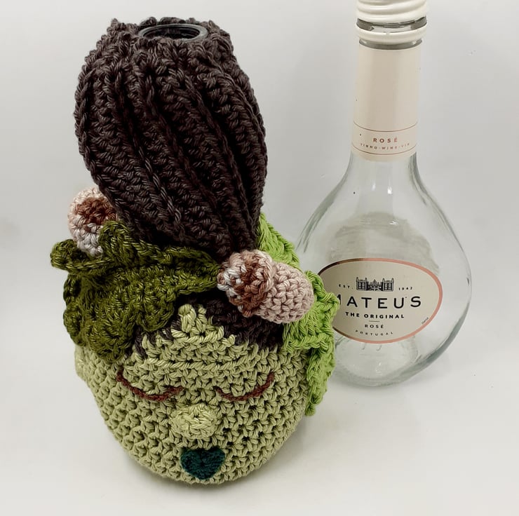 This Green Woman bottle vase is perfect for displaying a dried flower or two, or even some fresh blooms. It is made from a small wine bottle for which I have crocheted a cover in 100% cotton yarn. The hair is embellished with oak leaves and acorns and a sprig of ivy.The cover is not removable therefore care should be taken when filling and emptying the bottle.