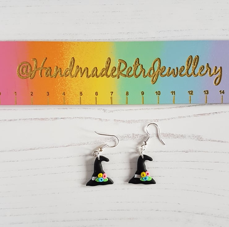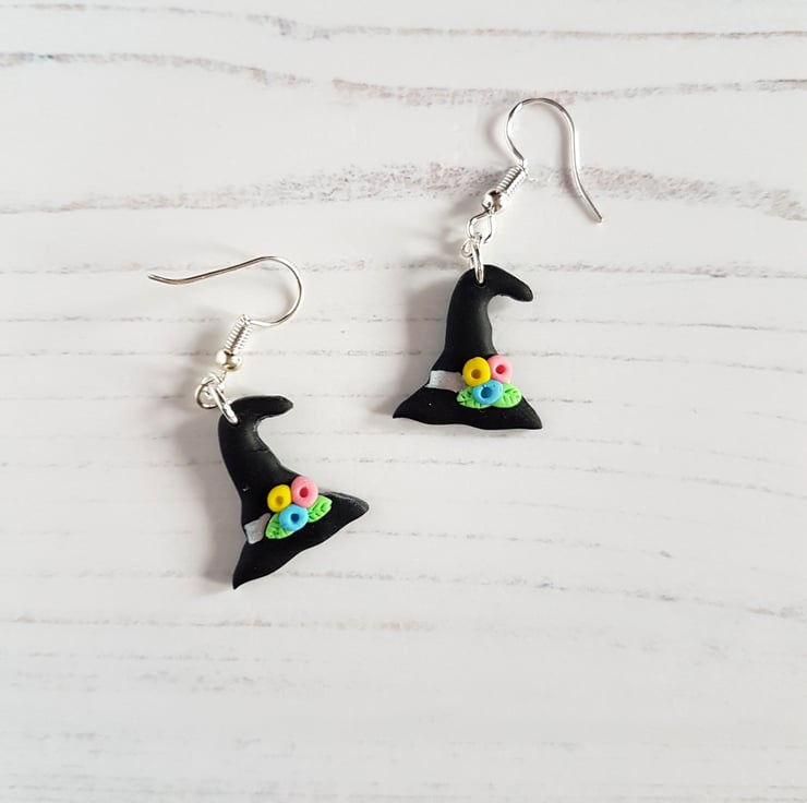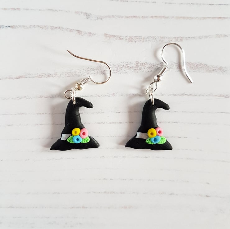 These pretty earrings have been carefully hand crafted using black polymer clay, with some brightly coloured flowers added to the top and a silver band hand painted.