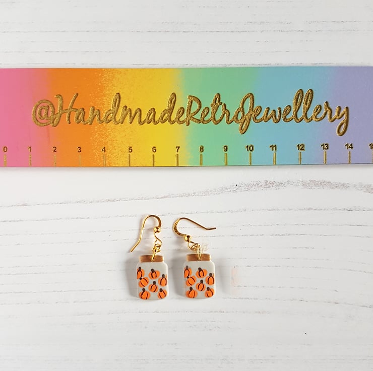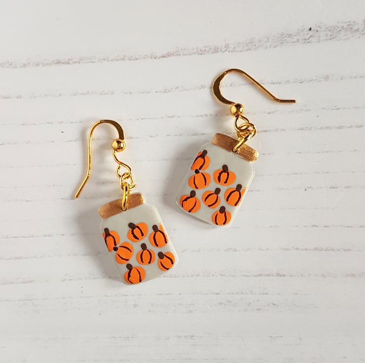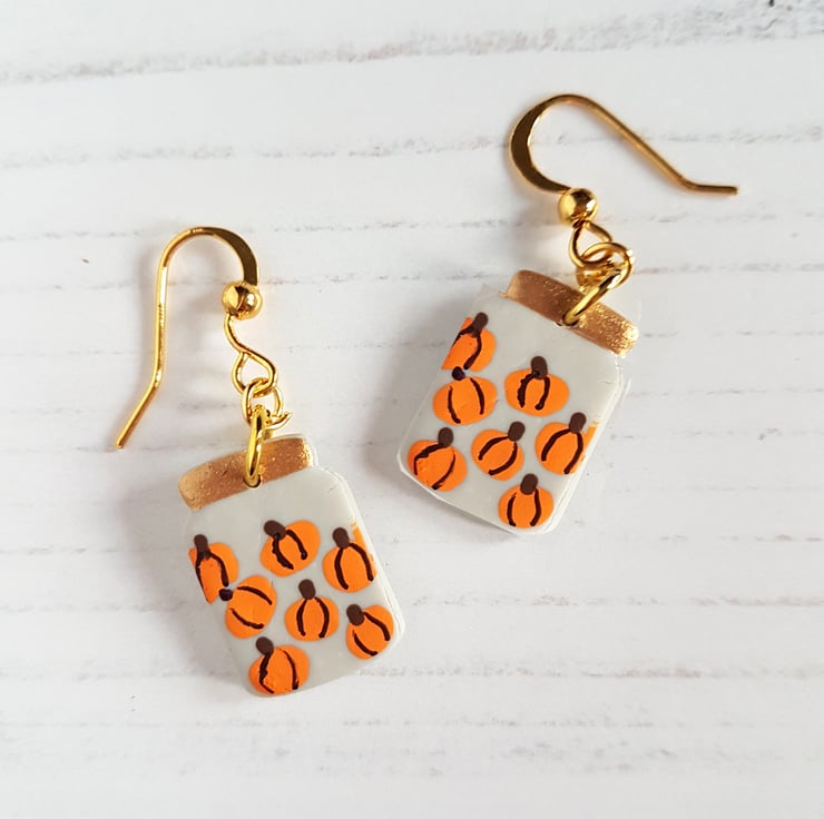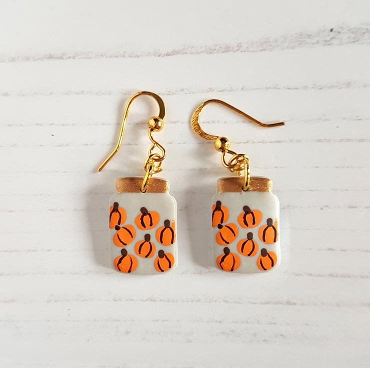 These beautiful jar shaped earrings have been carefully hand crafted using grey polymer clay, with tiny orage pumpkins hand painted, and a gold lid to finish The jars are then fixed onto gold plated hook style fixings for a drop effect finish.