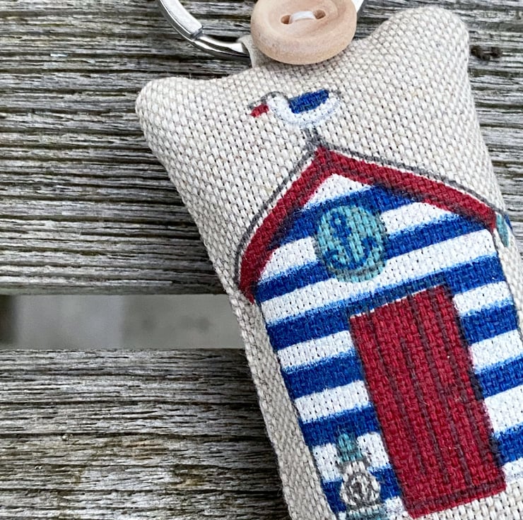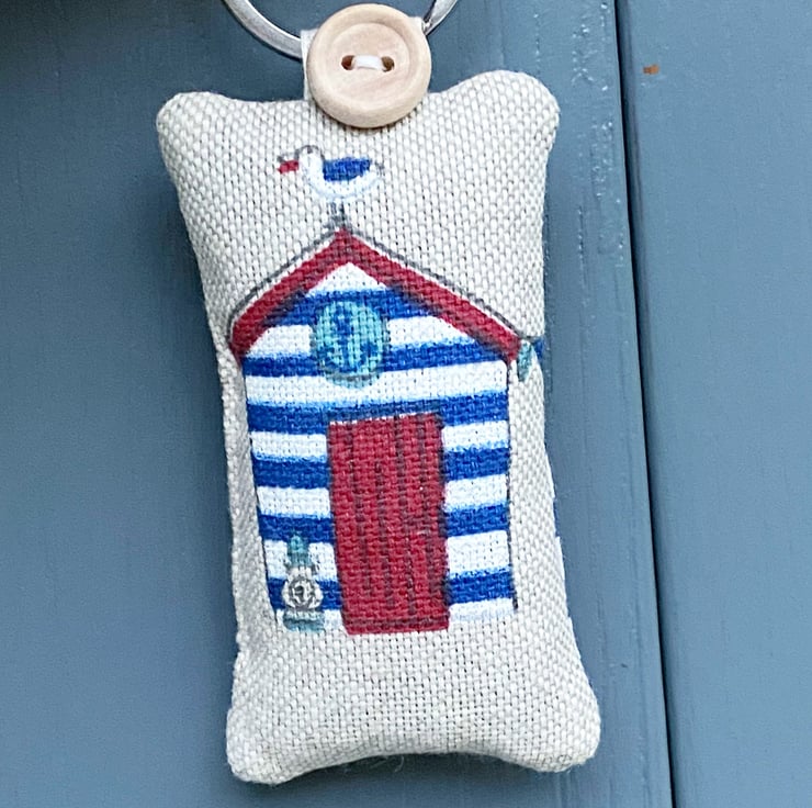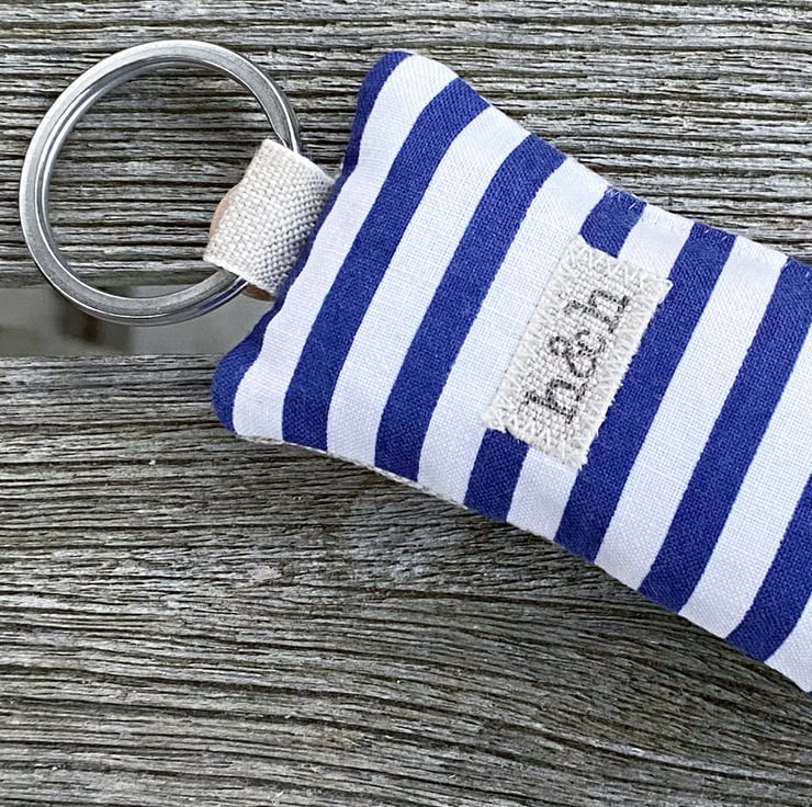 The key ring is made of linen-look cotton and is very generously filled with locally grown, gloriously scented lavender. Fragrant and tactile, the key ring is finished with a rustic wooden button on one side and a linen 'heatherandhome' label on the other side. The stainless steel ring is attached with a linen tape loop.