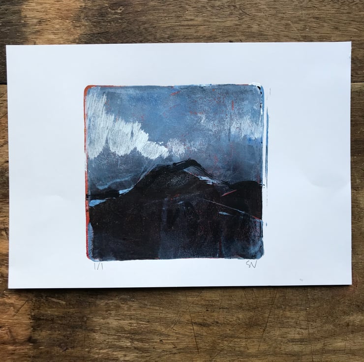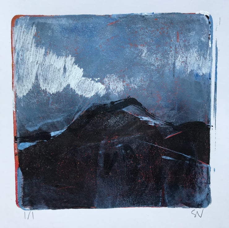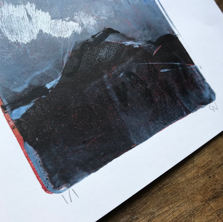 This monotype print is made by rolling acrylic paint thinly onto a gel plate, then working directly into the paint. Multiple layers are transferred onto paper to create the final image. A single print is made using this process, making it completely unique.
