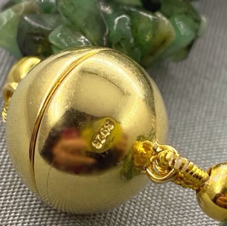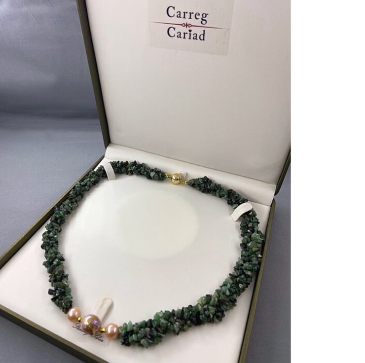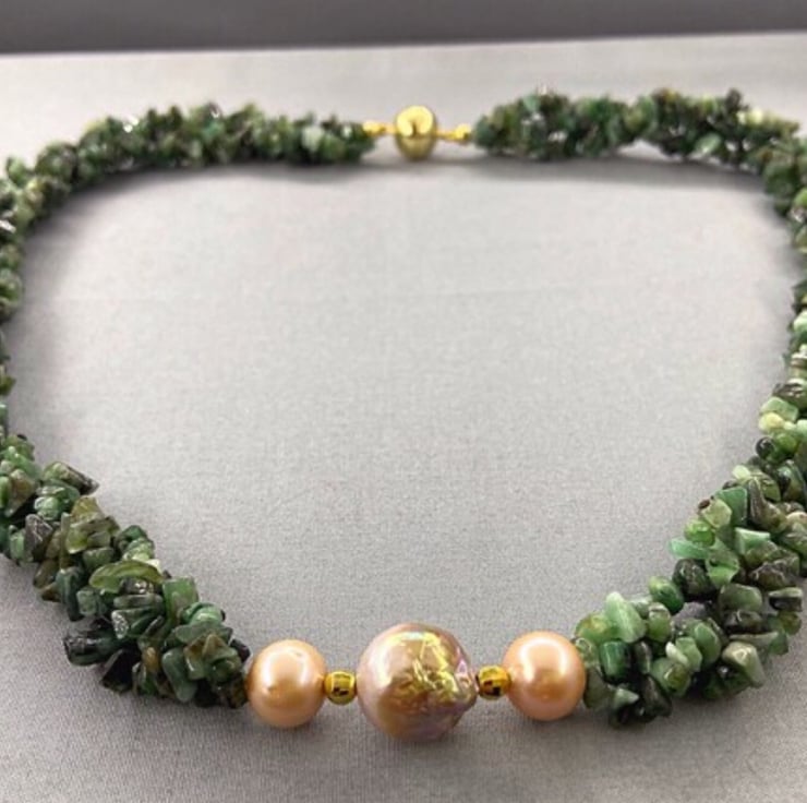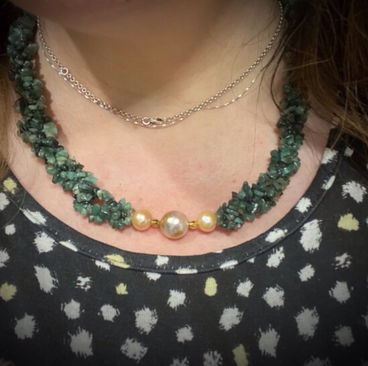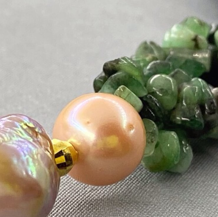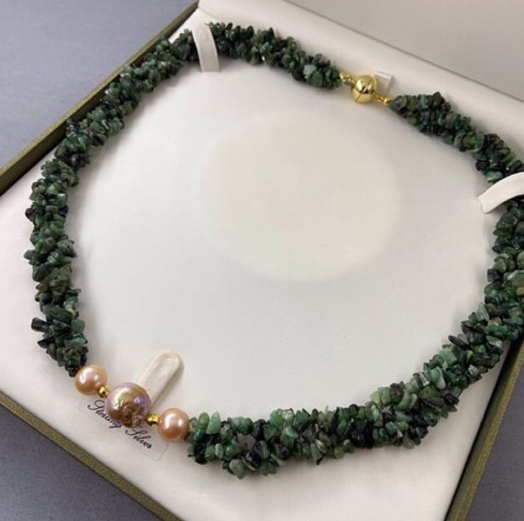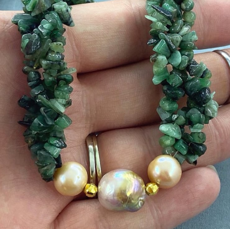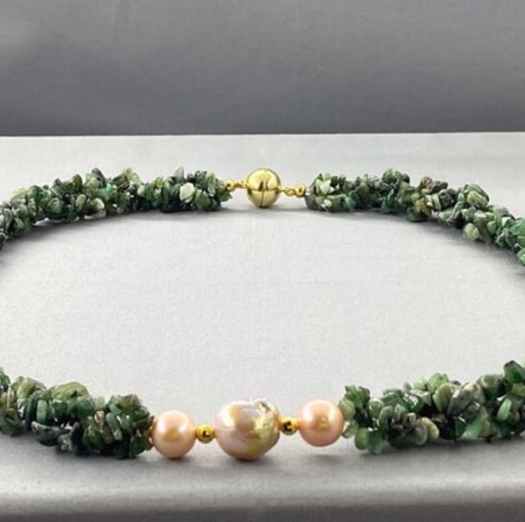A truly stunning and elegant necklace featuring approximately 200 carats of genuine emeralds with 2 gold round cultured pearls and a metallic nucleated freshwater pearl with 9ct gold filled sterling silver.
