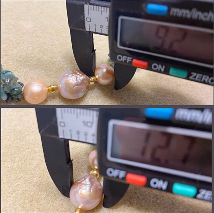 Pearl sizes are gold just over 9mm and the metallic is just over 12mm.