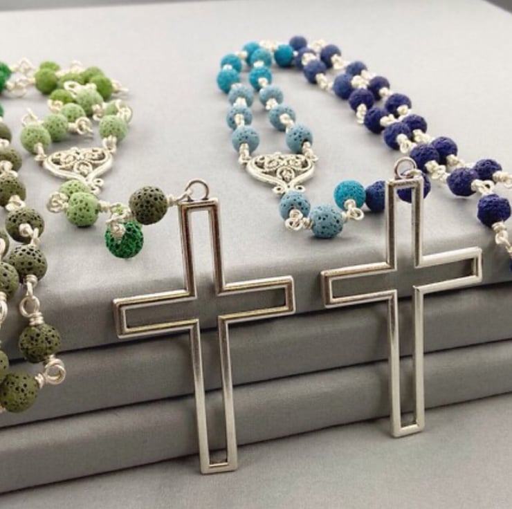 A 24 inch rosary style necklace featuring ombré toned lava rock and sterling silver filled copper elements. This boho/gothic rosary is sized so it will go over the standard adult head as there is no clasp to this necklace.