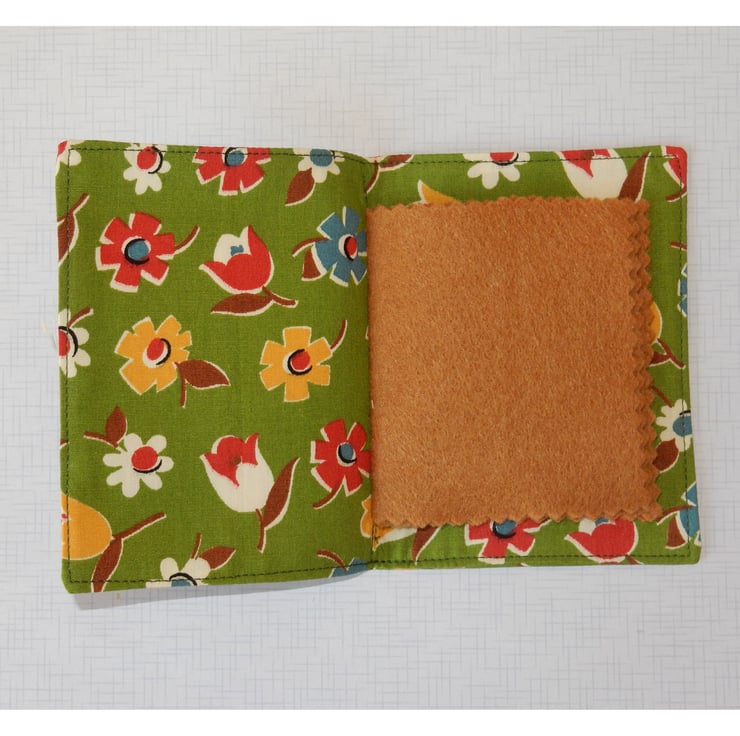 This is a cute needle case for lovers of owls, there is an owl picture on the front and reverse of the case, teamed with a floral fabric, also used for the lining. It measures approx. 4.5 x 3 inches, it has four tan felt leaves for your pins and needles.