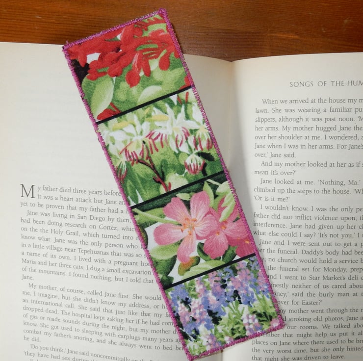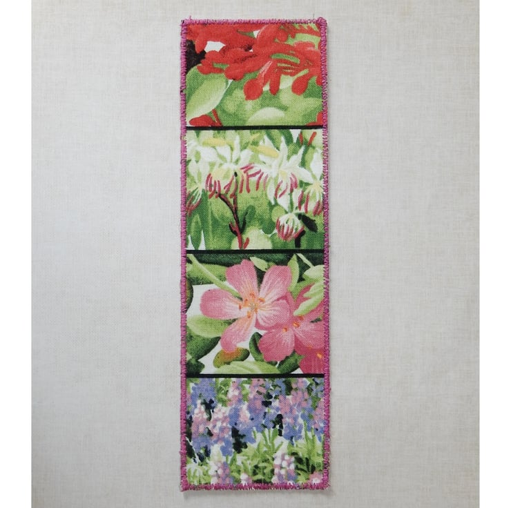 This bookmark would make a great small gift for flower lovers, it measures 2.5 x 8 inches and features four pictures of flowers in shades of pink, lilac and red. The edge is stitched in deep pink thread. It would be ideal to keep your place in your favourite novel.
