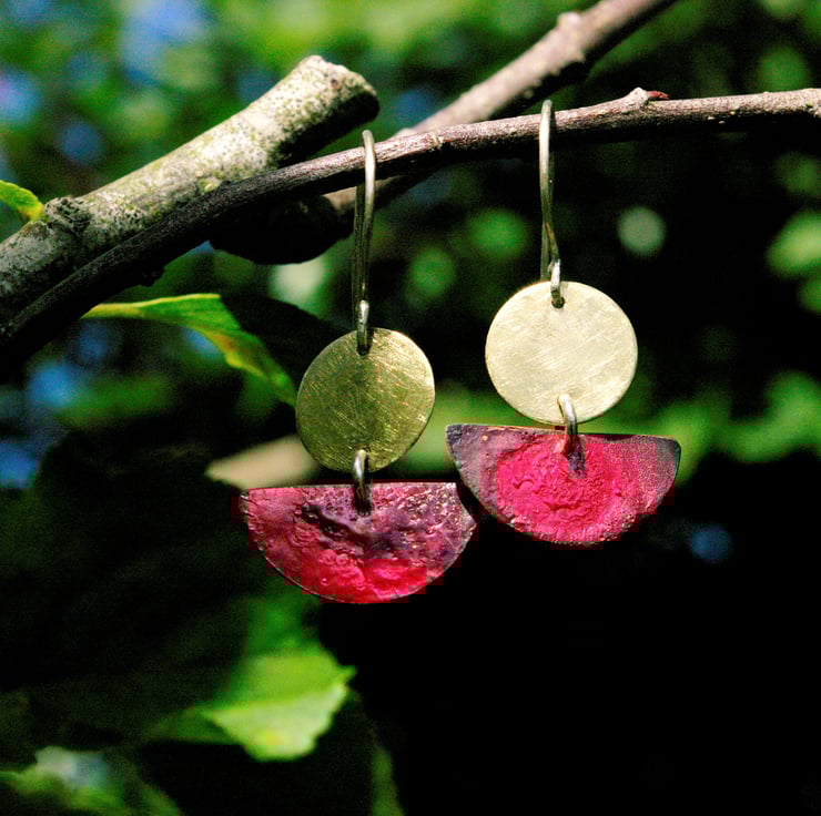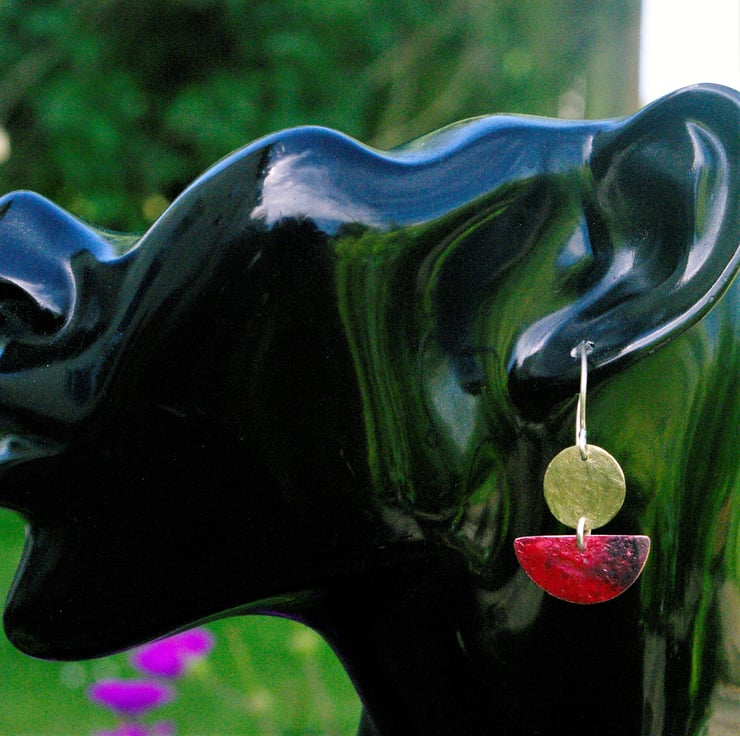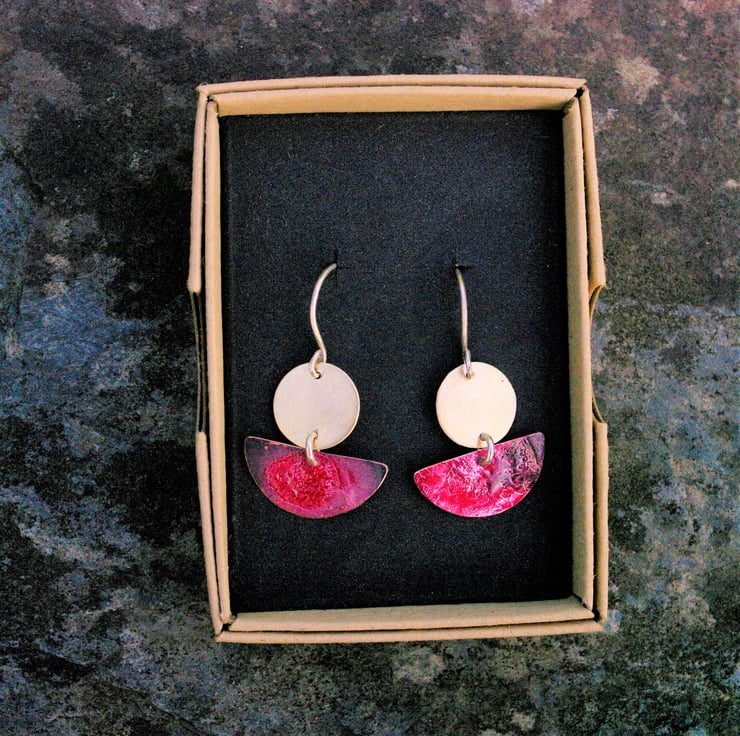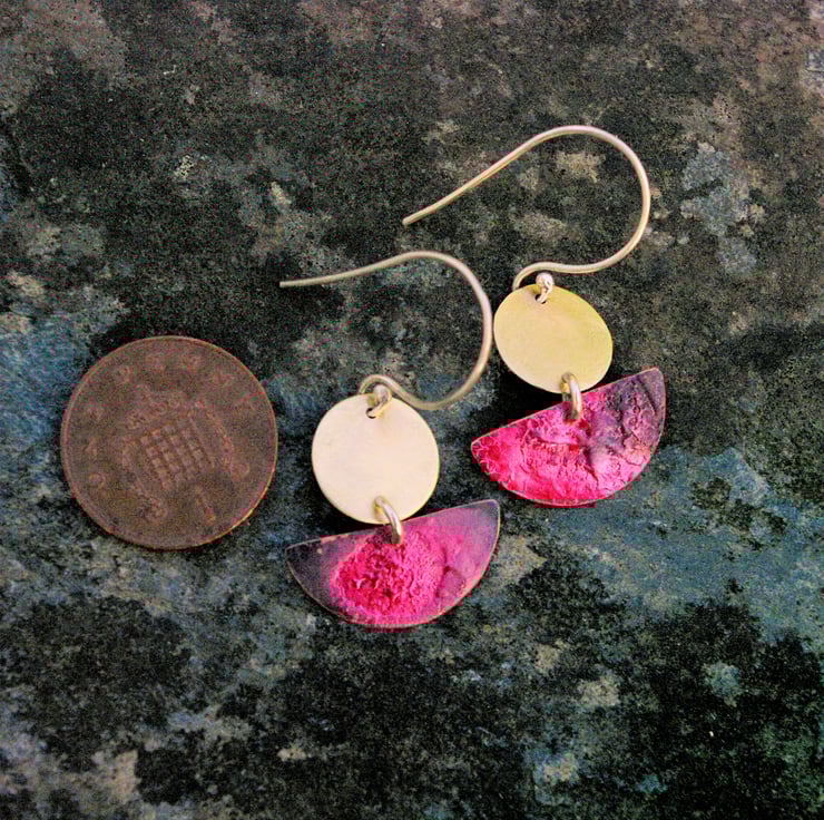 I have cut out pieces of copper into arc shapes, with a diameter of 22mm/ just under 1 inch . These hang under brass circles 12mm in diameter. I have treated the copper with heat to produce red, dark red, purple and black tones with some surface texture; the colours are preserved with a penetrating wax polish.