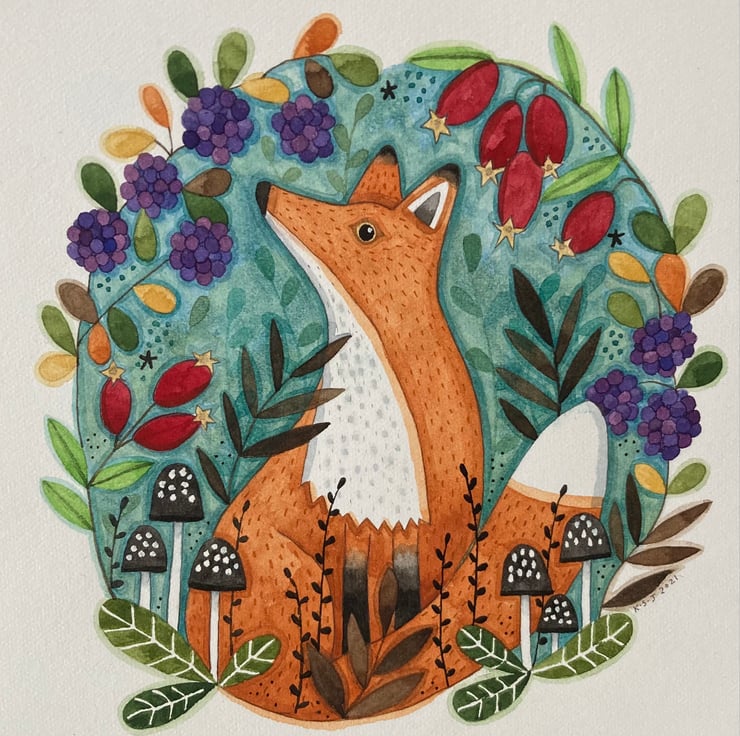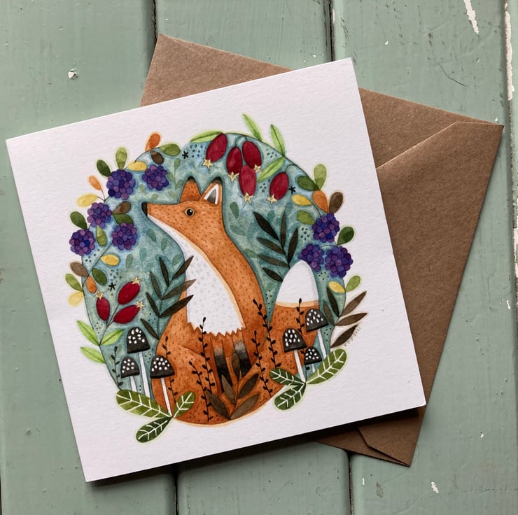 Blackberry Fox is a 12.5cm square greeting card, printed on high quality 300gsm white wove board, blank inside and supplied with recycled envelope. From an original design by Three Acorns.