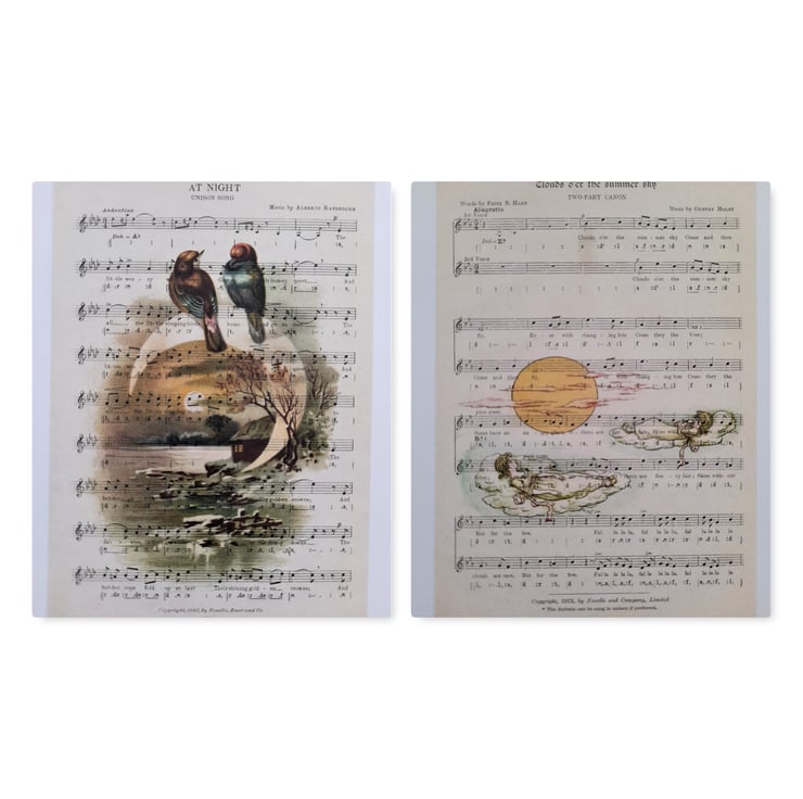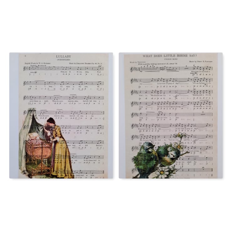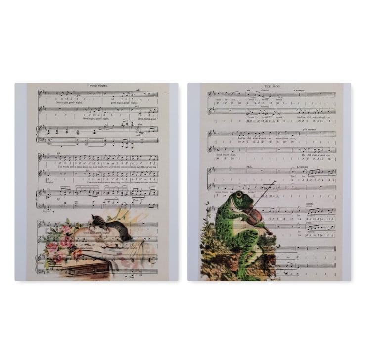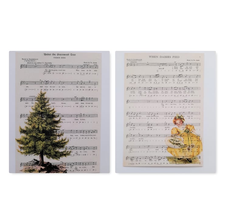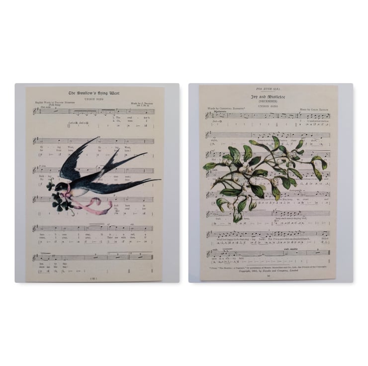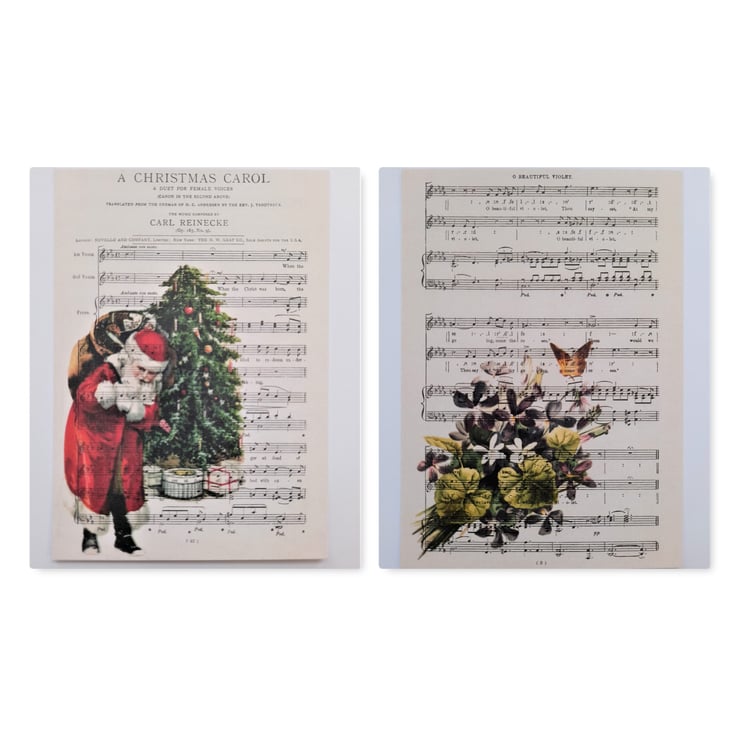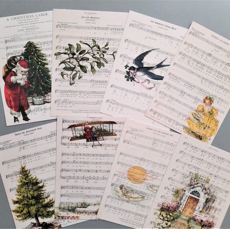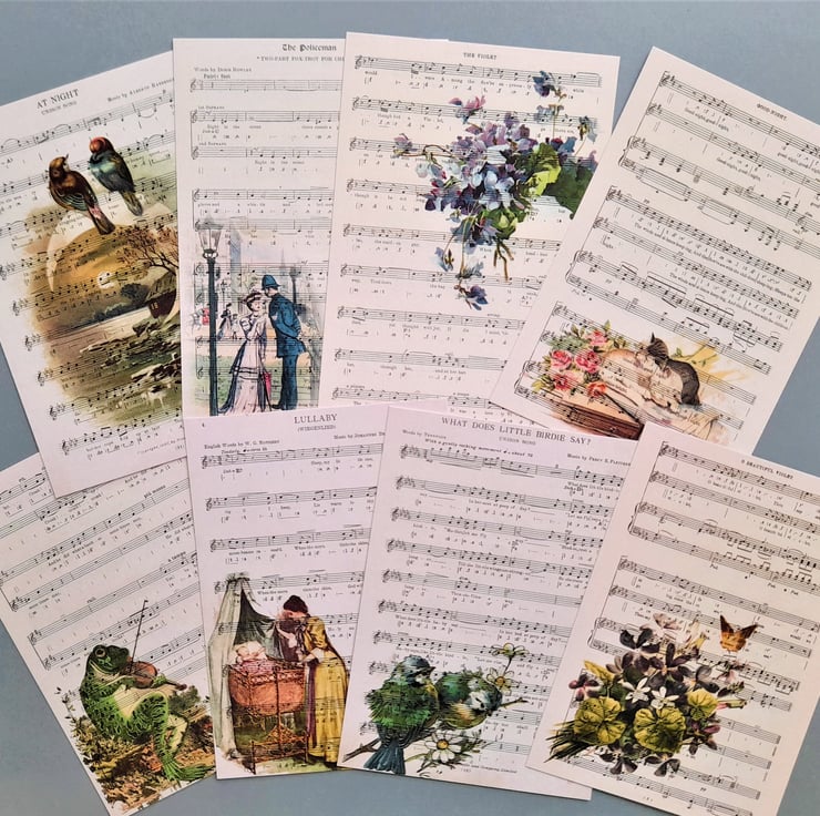 To make the design, I printed the vintage images onto old music scores and then scanned them to create the notecards. Professionally printed. Handmade by me.