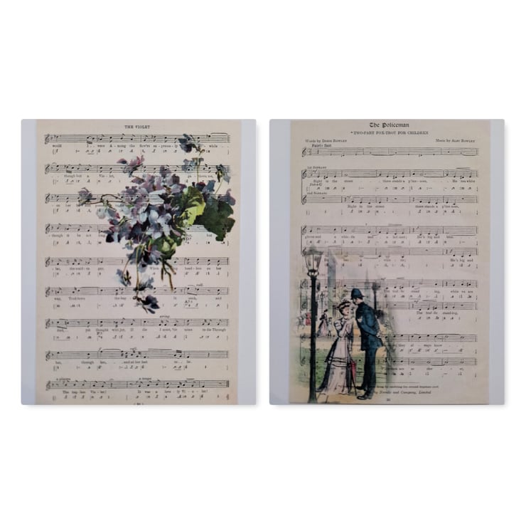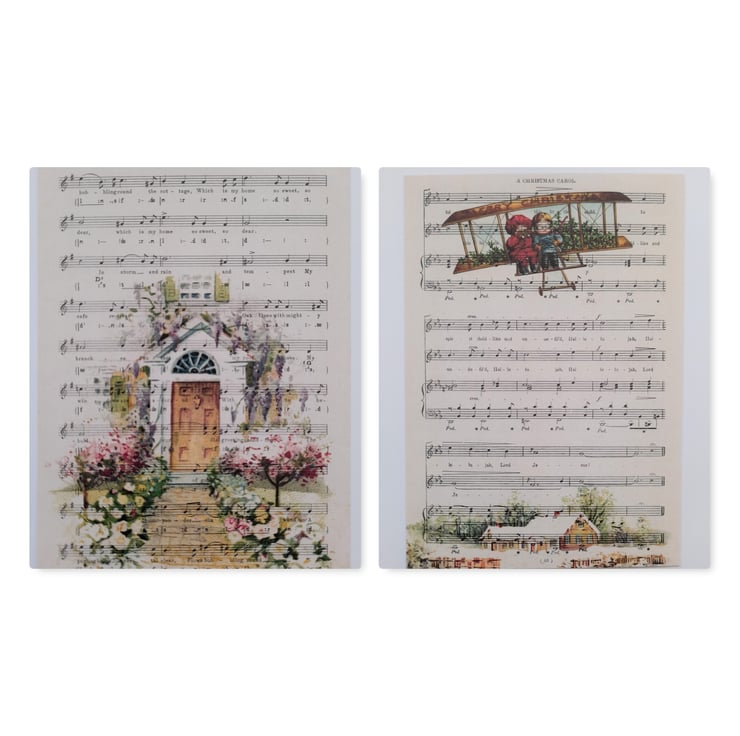 A pack of 16 x handmade correspondence cards with a music sheet and vintage image design on the front and plain white on the reverse. A6 size (14.85cm x 10.5cm), printed onto lovely white 350gsm. There are 16 different designs.