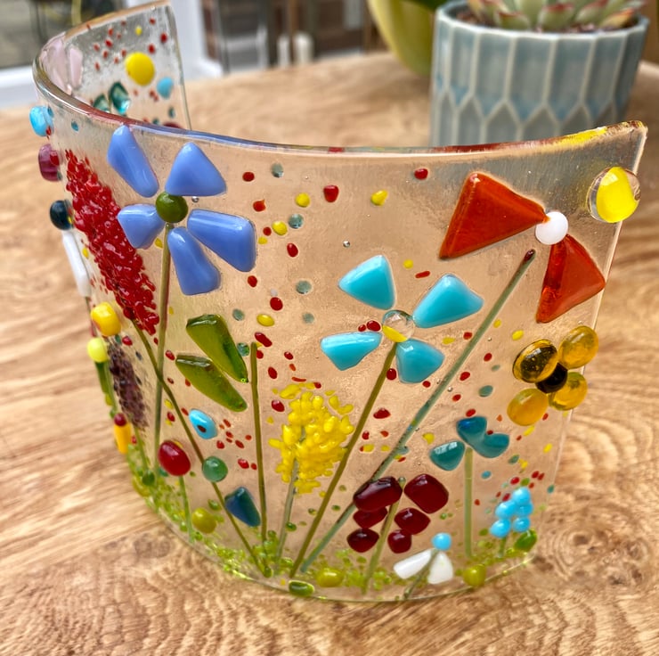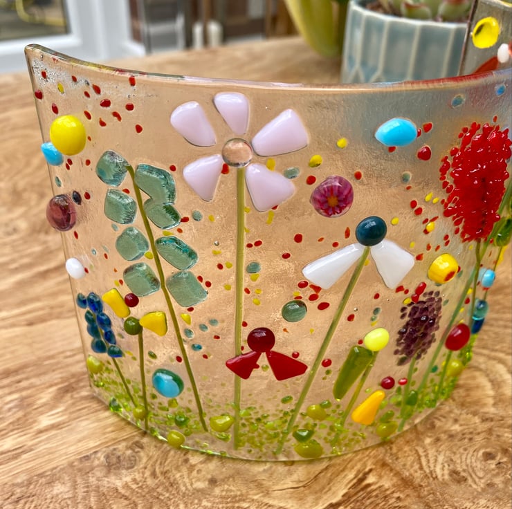 The flowers are made from hand cut glass elements which are fused to a piece of clear glass before being fused a second time over a mould to create the curved shape.