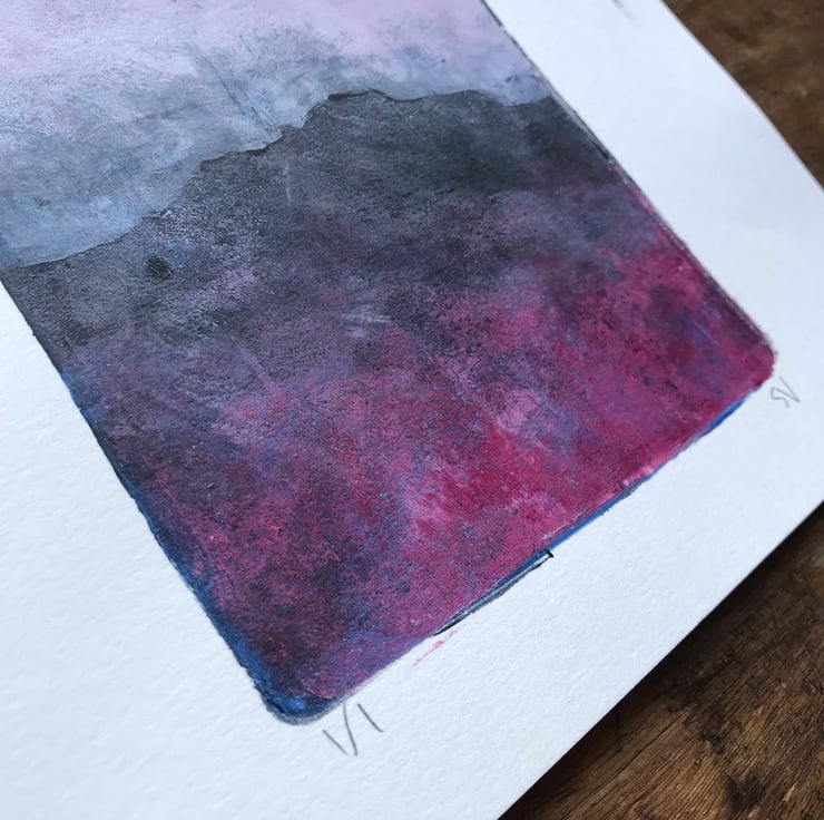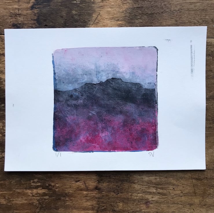 This monotype print is made by rolling acrylic paint thinly onto a gel plate, then working directly into the paint. Multiple layers are transferred onto paper to create the final image. A single print is made using this process, making it completely unique.