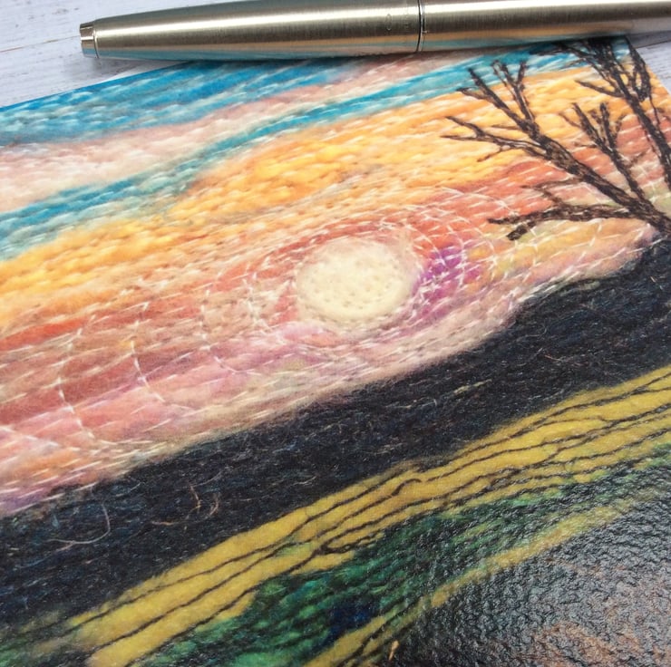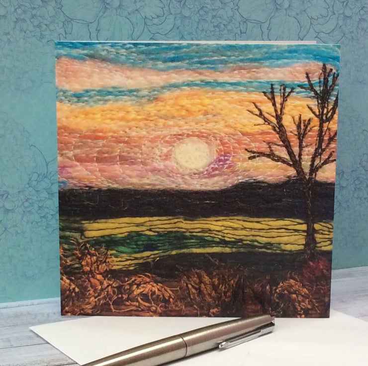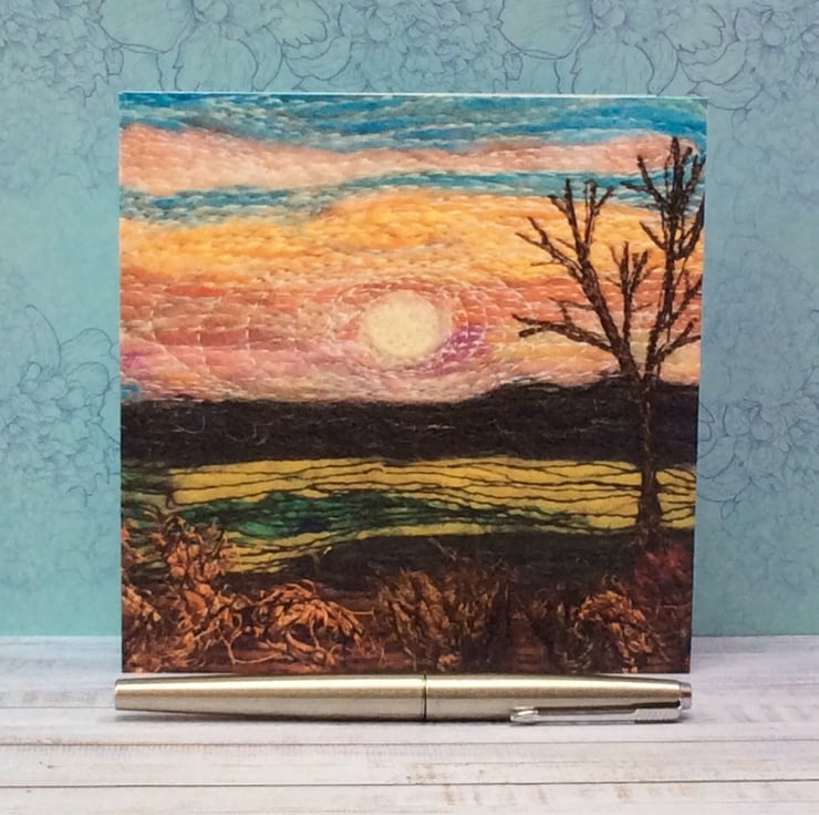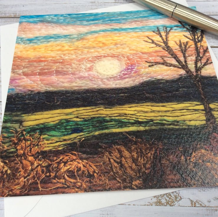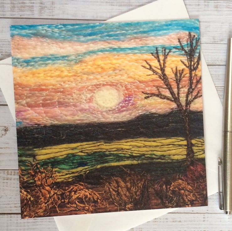 This card is a print of one of my free motion embroidered needle felted stylised sunset landscape of Yorkshire. It’s blank inside making it ideal for any occasion. The card measures 14.5 x 14.5cm and it comes with an envelop in a plastic cover for protection.