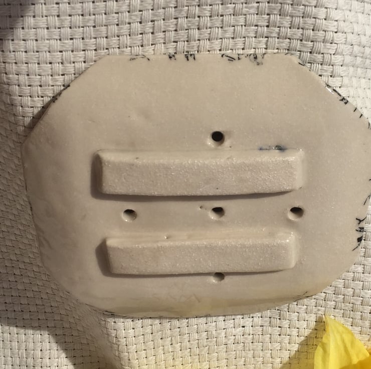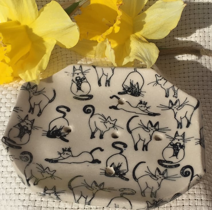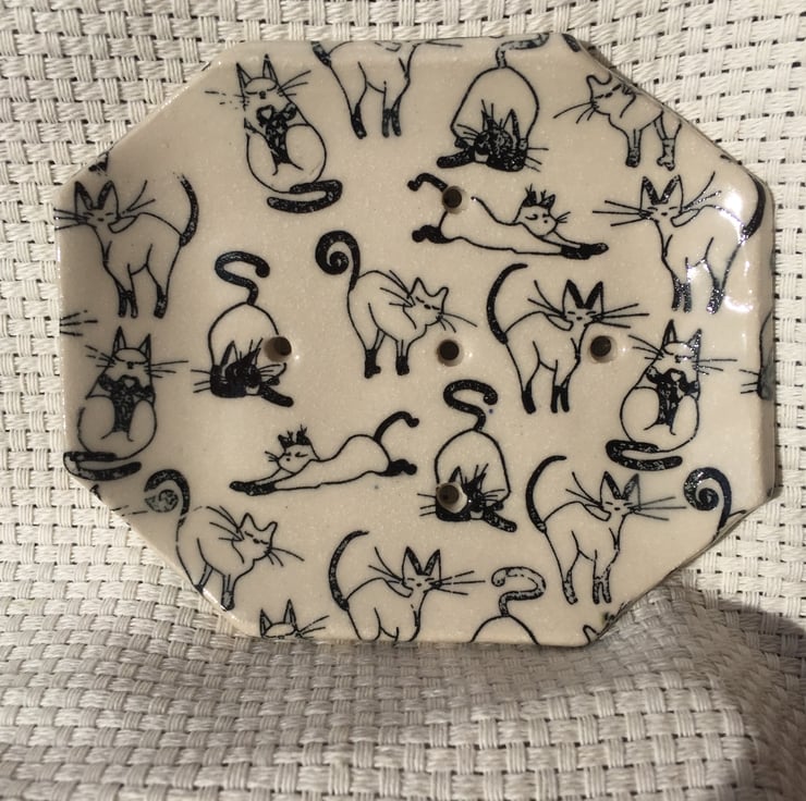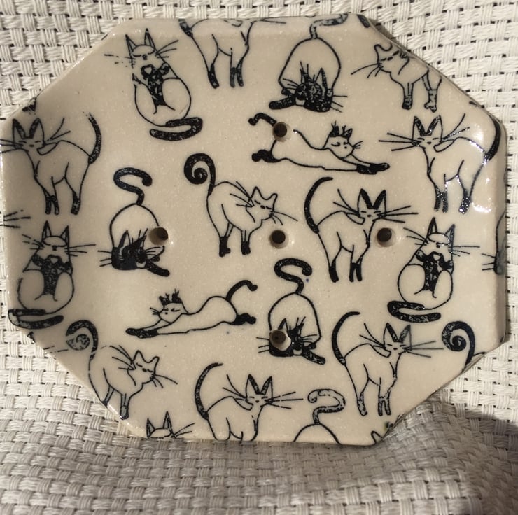 Stoneware soap dish that has been decorated with black cats.
