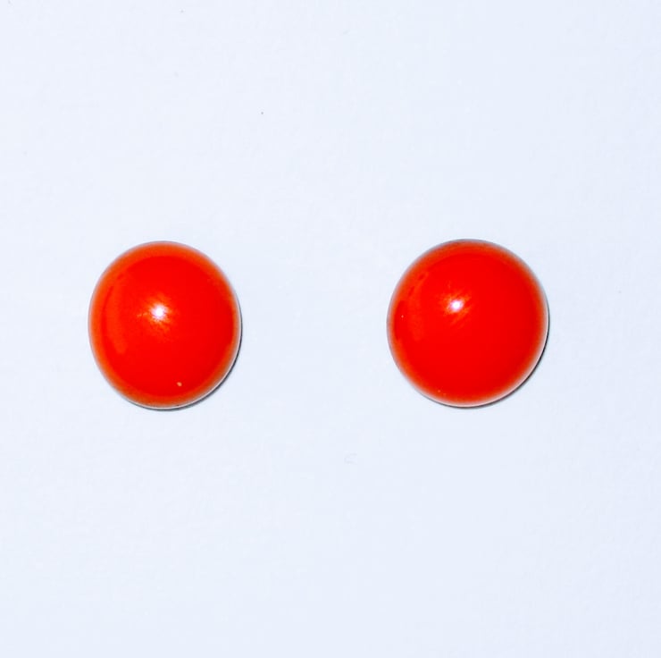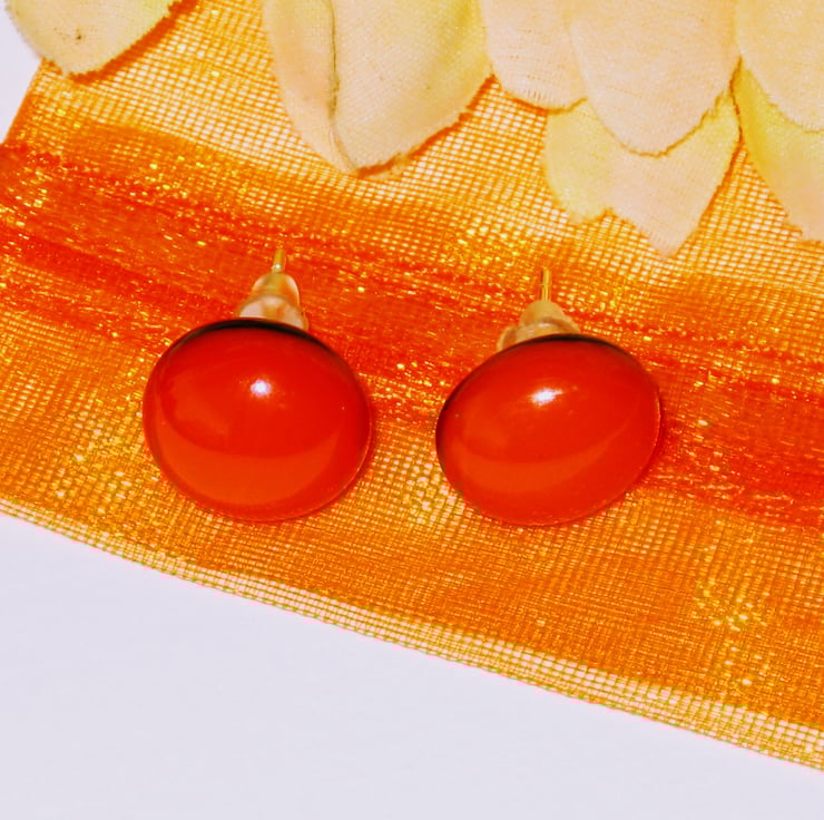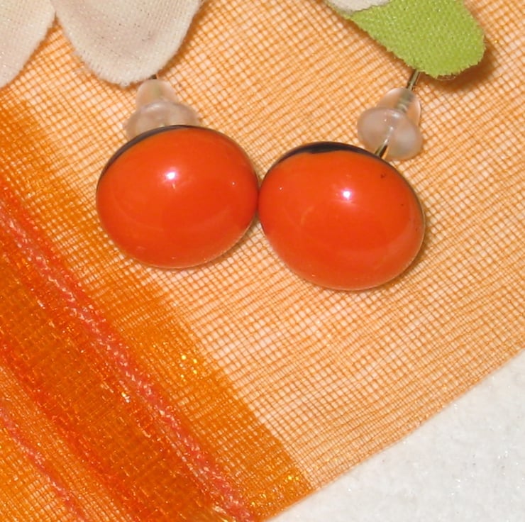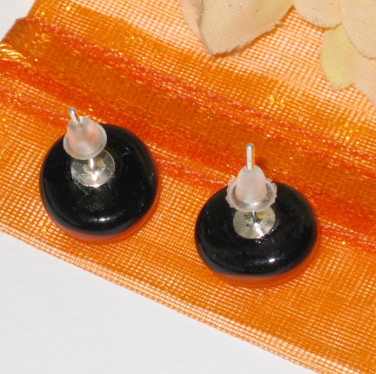 Pair of orange on black 10mm round stud earrings handmade from quality opaque Bullseye glass. Created by kiln fusion. Sterling silver ear posts with soft rubber hypoallergenic safety stoppers.