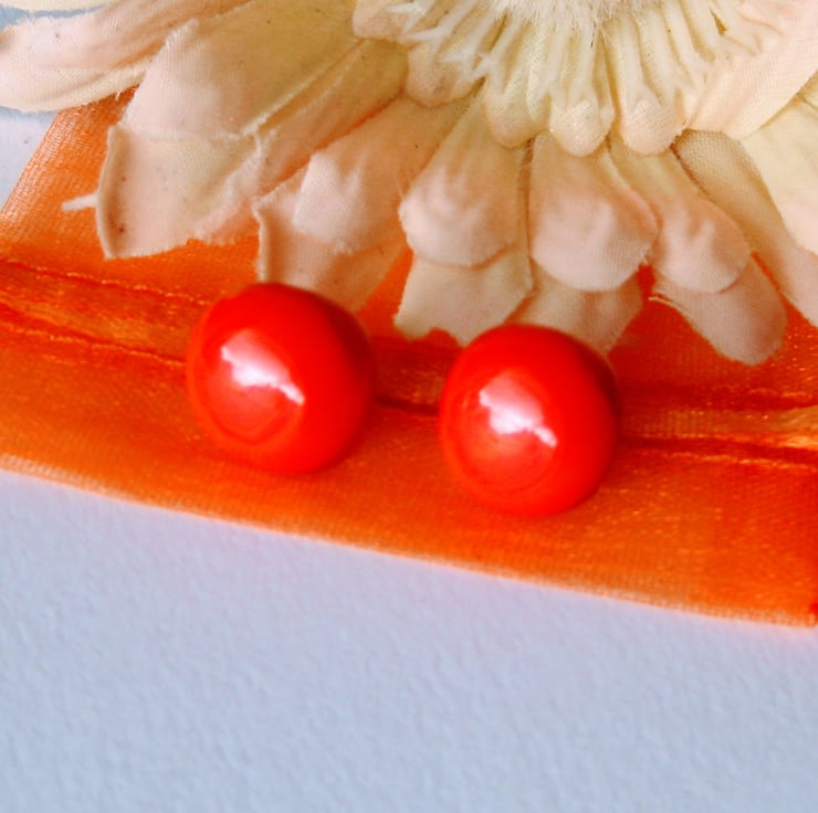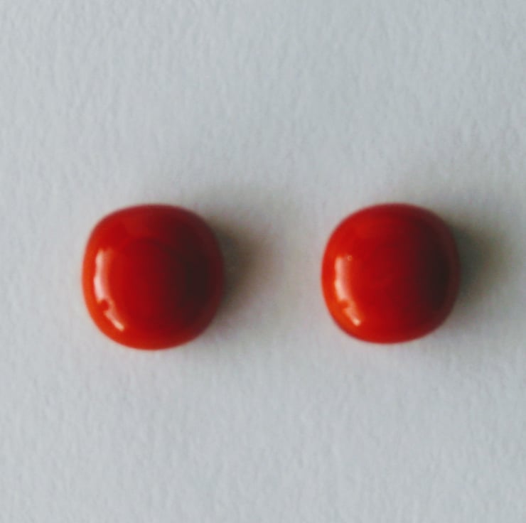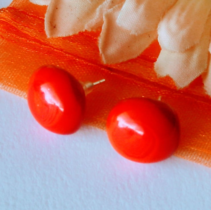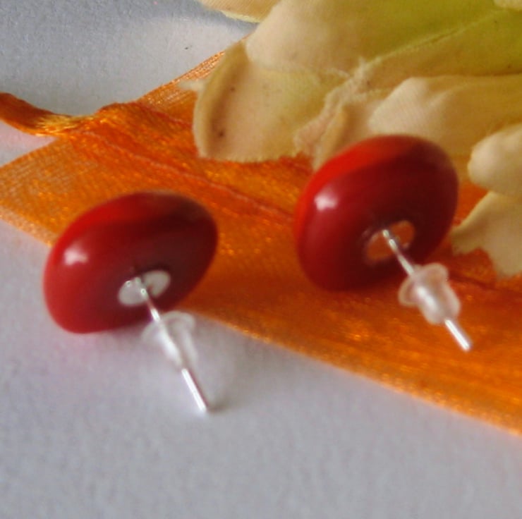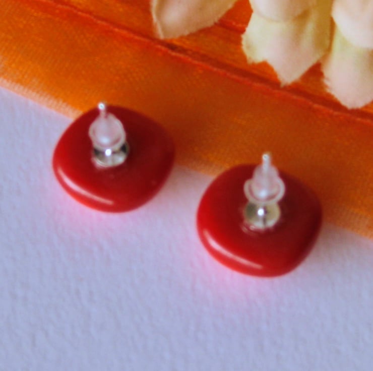 Pair of orangey-red on red 13mm almost square shaped stud earrings. Handmade from quality opaque and mosaic glass. Created by kiln fusion. Sterling silver ear posts with soft rubber hypoallergenic safety stoppers.