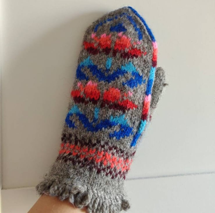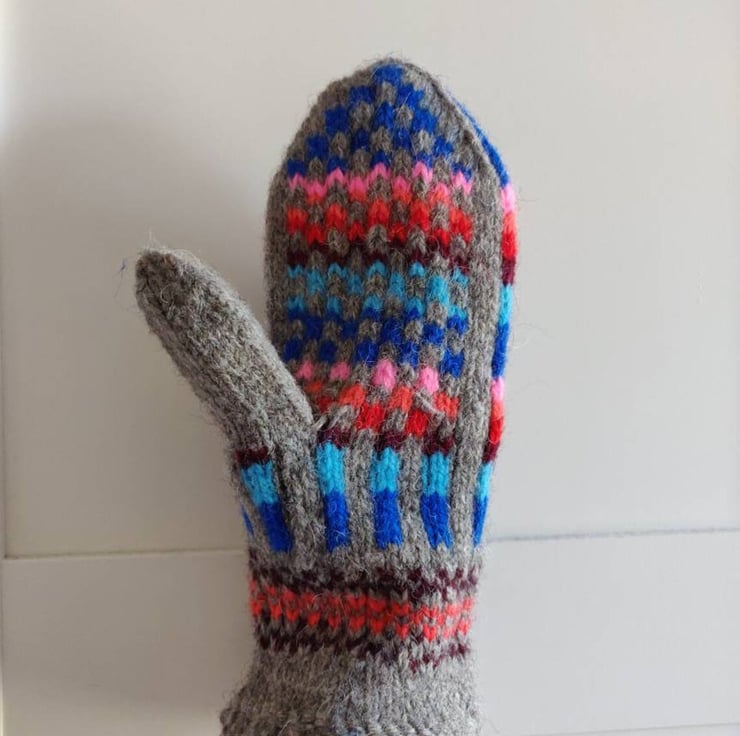 Hand knitted mittens in grey, red, pink and blue fairisle pattern.