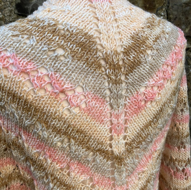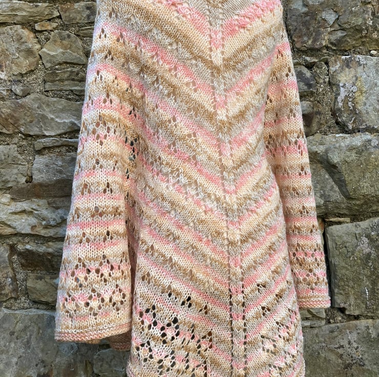 My design, I used a flower lace stitch and a diamond lace stitch. All over lace on both panels parted by a subtle cable plait spine.