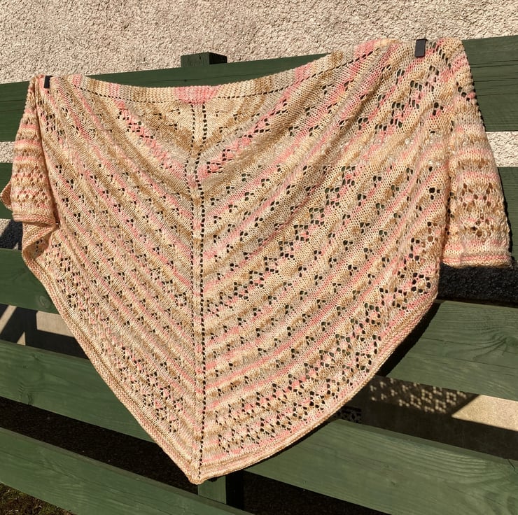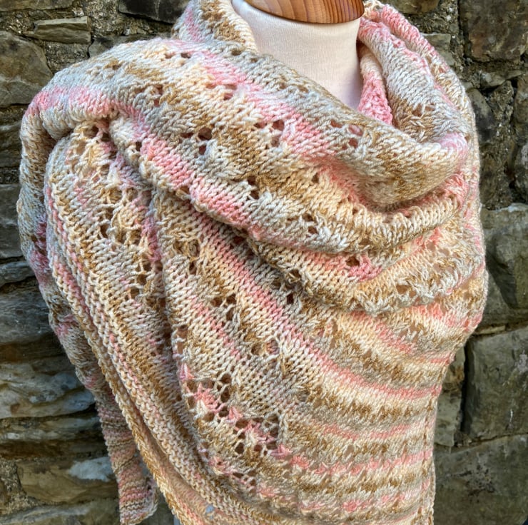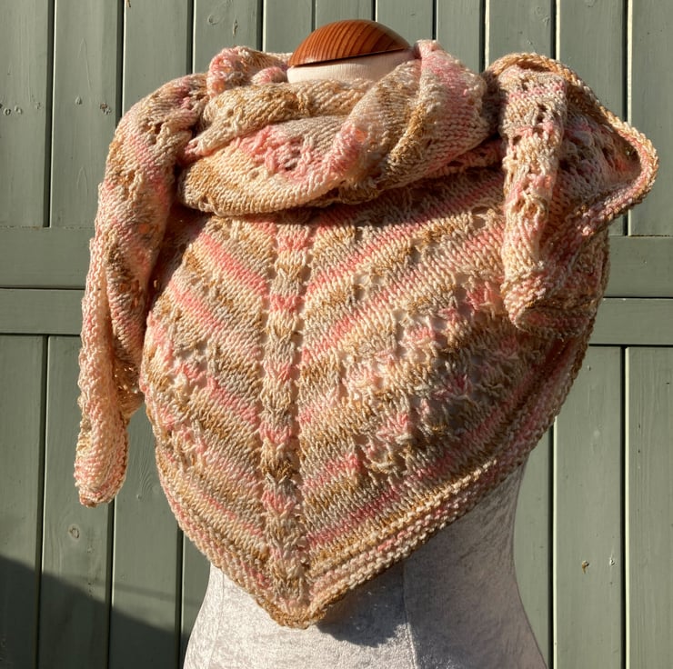 Triangle shawl hand knitted top down mixing the texture of cables with the lightness of lace