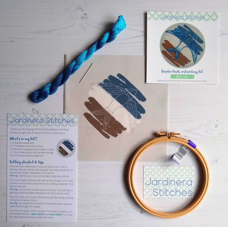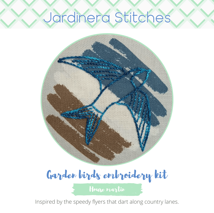 All summer long I watch house martins zoom along country lanes, under canal bridges and in between hedgerows. They are so fast and lively, narrowly missing my head! If your eye is quick enough you can catch their vivid blue colour, which I have echoed in the hand-dyed embroidery thread in this kit.