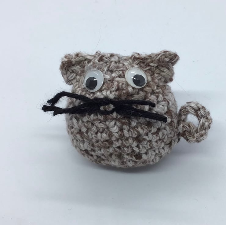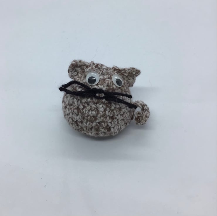A cute little cat crocheted from brown & white cotton with googly eyes and black whiskers. He measures approximately 6cm tall.