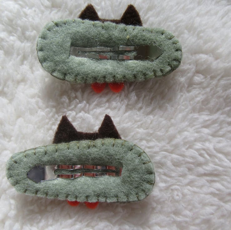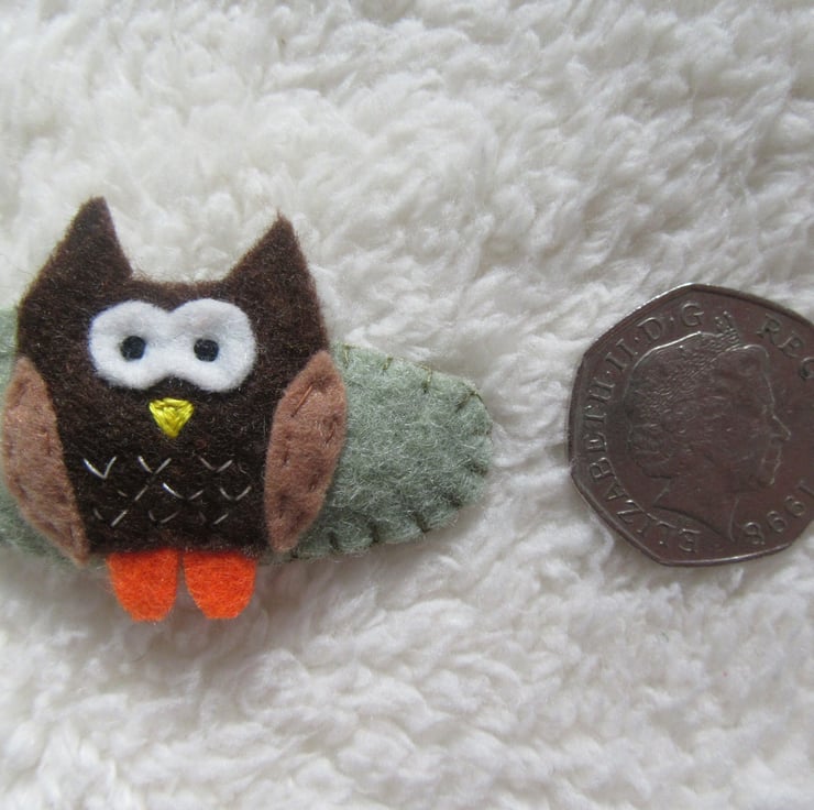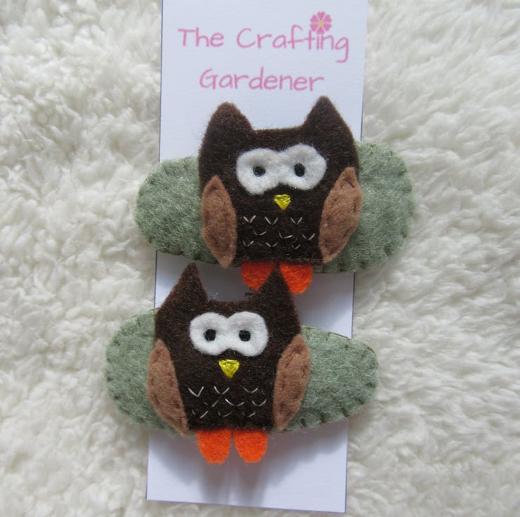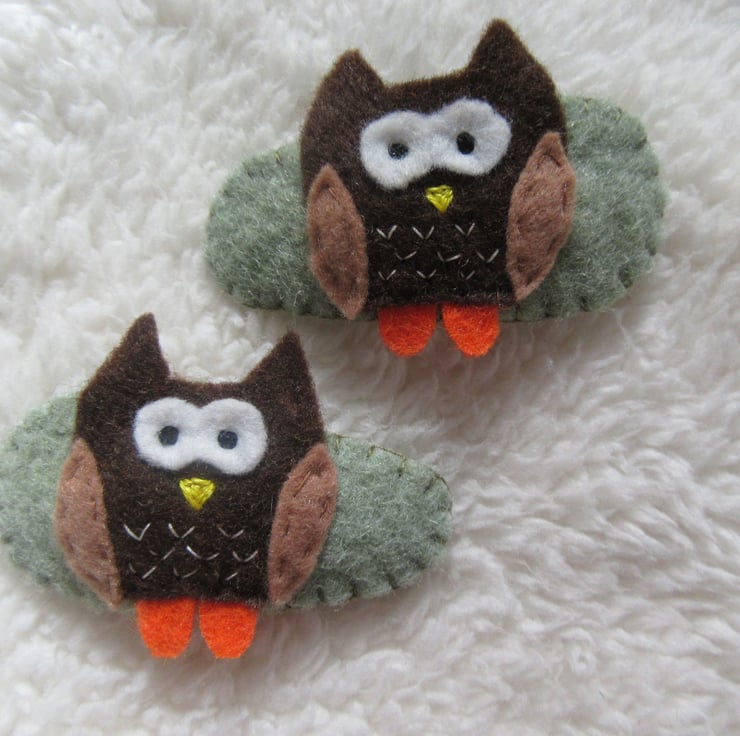 Each is hand stitched and made from both acrylic and 100% wool felt. These owls have orange feet and hand embroidered yellow beak and feather details.