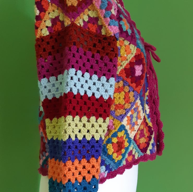 I have designed and hand crochet this multicolour cardigan in premium acrylic double knitting weight yarn. The main body is granny squares, triangles and quarter triangles, with striped sleeves, a scallop edge and neck ties. The cardigan has been finished by hand sewing, and it has been washed and blocked, so is ready to wear.