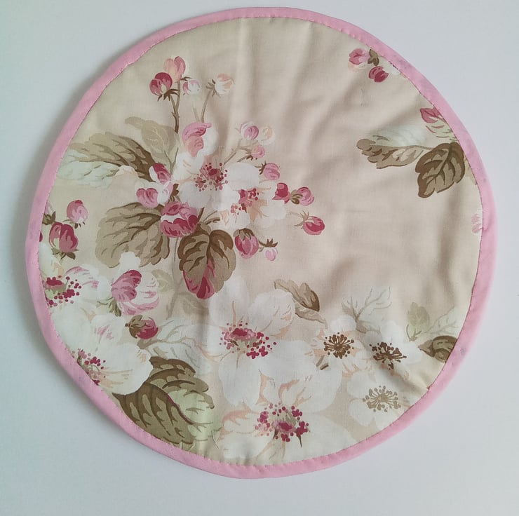 The mat is in a pink theme and has a bias binding edging with a polyester wadding filling.