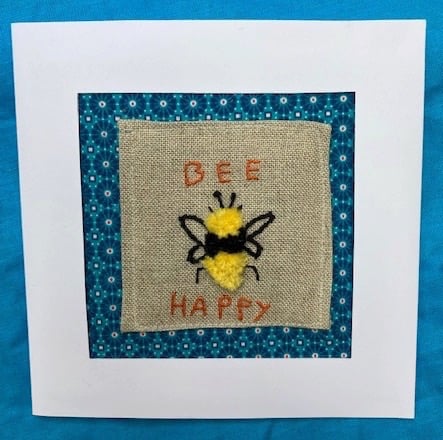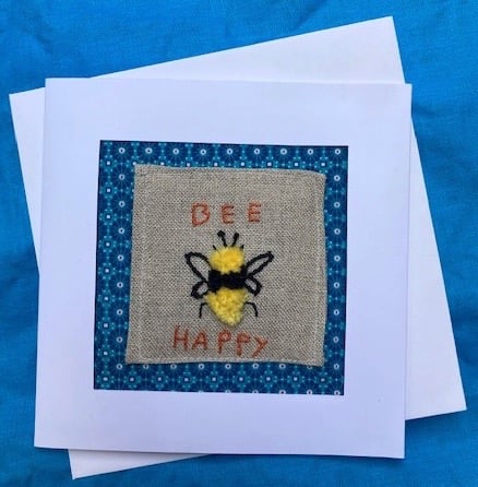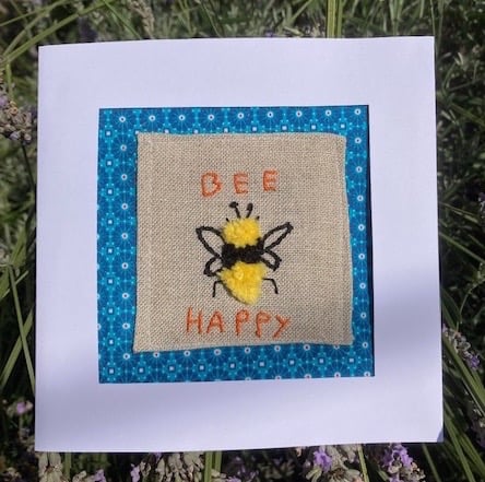 This happy little fluffy bee with its cheery message has been hand embroidered onto natural linen, sewn on a blue retro flower patterned cotton and mounted in a white aperture greetings card (14.3cm x 14.3cm) which comes with a matching white envelope. This inside of the card has been left blank for your own message. The card could also be hung as a little work of art.