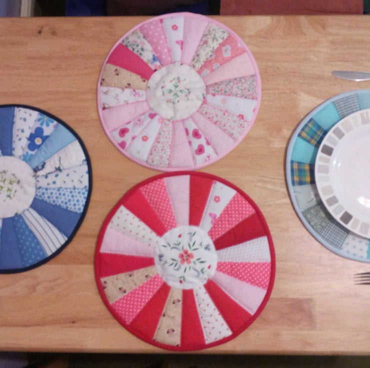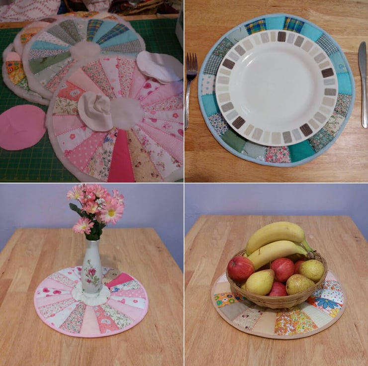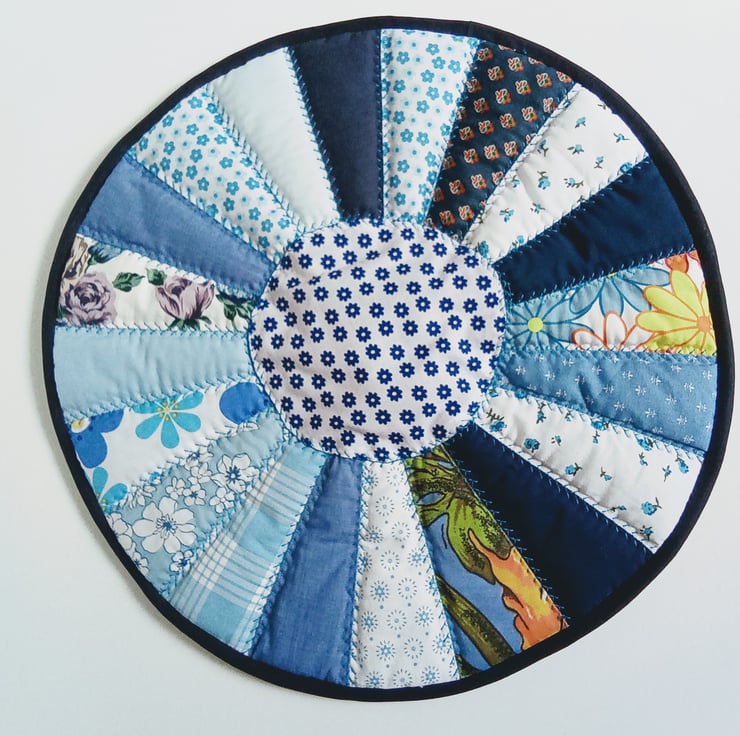 This is a round patchwork & quilted table mat in a Dresden plate design which can be used as a placemat or table centrepiece.