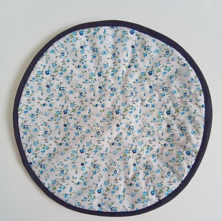 The mat is in a blue theme and has a bias binding edging with a polyester wadding filling.