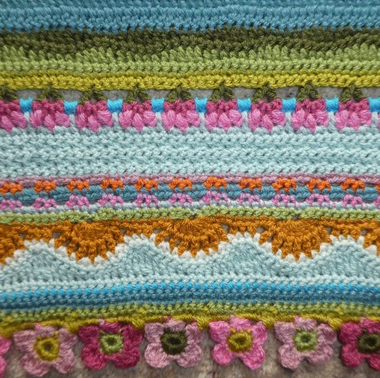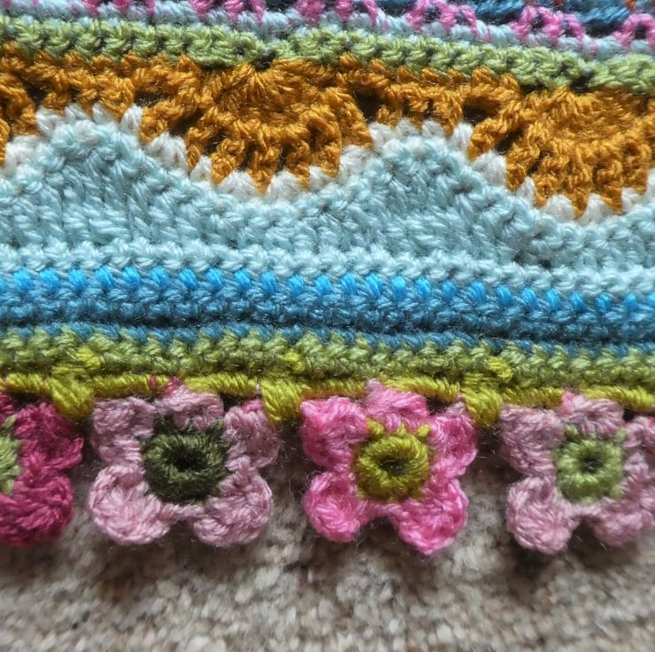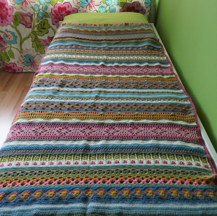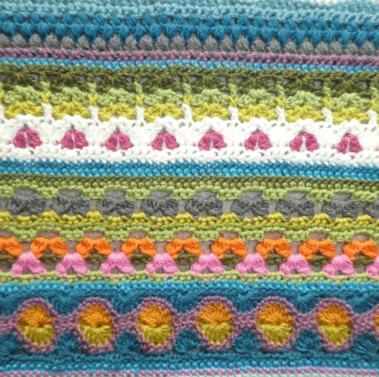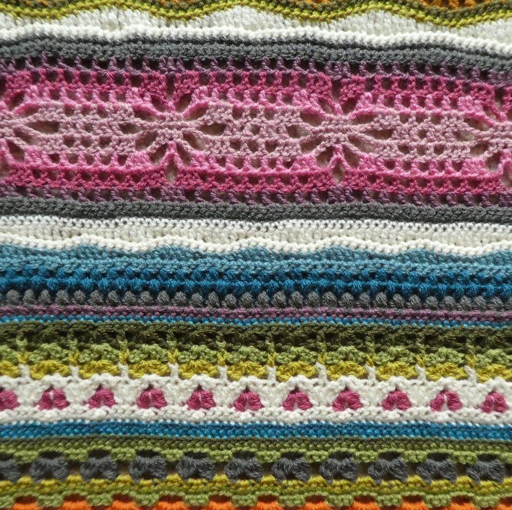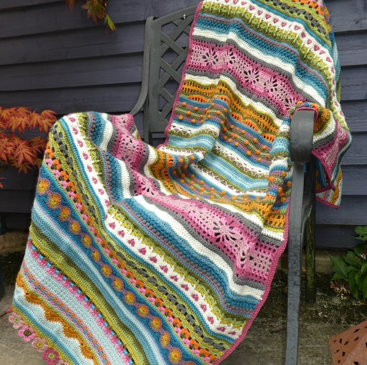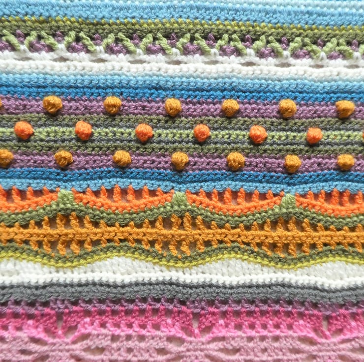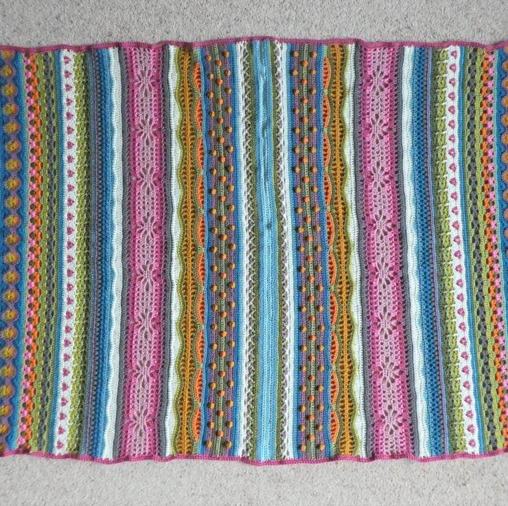 I have created this stripped crochet blanket in a mix of different crochet stitches, based on the pattern by Janie Crow. The colours are all beautifully co-ordinated, and the yarns used are all lovely and soft premium acrylic, and are double knitting weight.